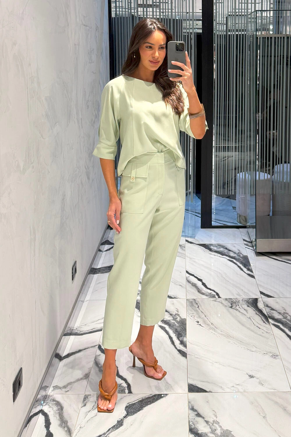 Calça confeccionada em tecido leve. A peça possui cintura alta, bolsos frontais com lapela, bolsos posteriores, shape cenoura, caimento reto, acabamento pespontado e fechamento frontal por zíper.