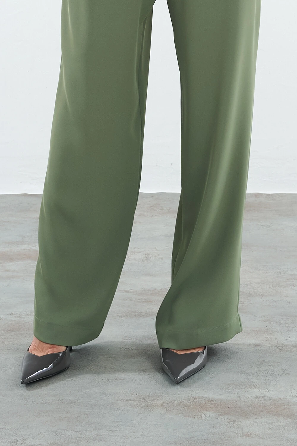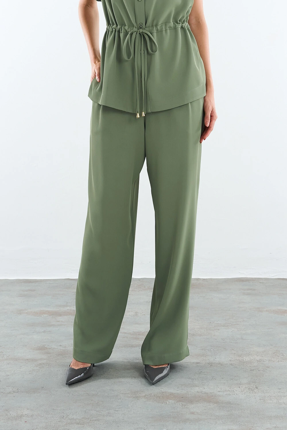 Calça confeccionada em tecido leve. A peça possui cintura alta, pequenas pregas frontais, bolsos frontais, bolsos posteriores, shape solto, caimento reto, acabamento pespontado e fechamento lateral por zíper.