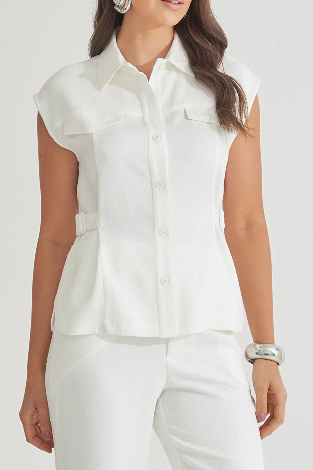 Camisa confeccionada em tecido leve. A peça possui colarinho clássico, ombros estendidos, recortes frontais e posteriores, bolso frontal decorativo, detalhe de fivelas forradas na lateral, shape solto, caimento reto, acabamento pespontado e fechamento frontal por botões.