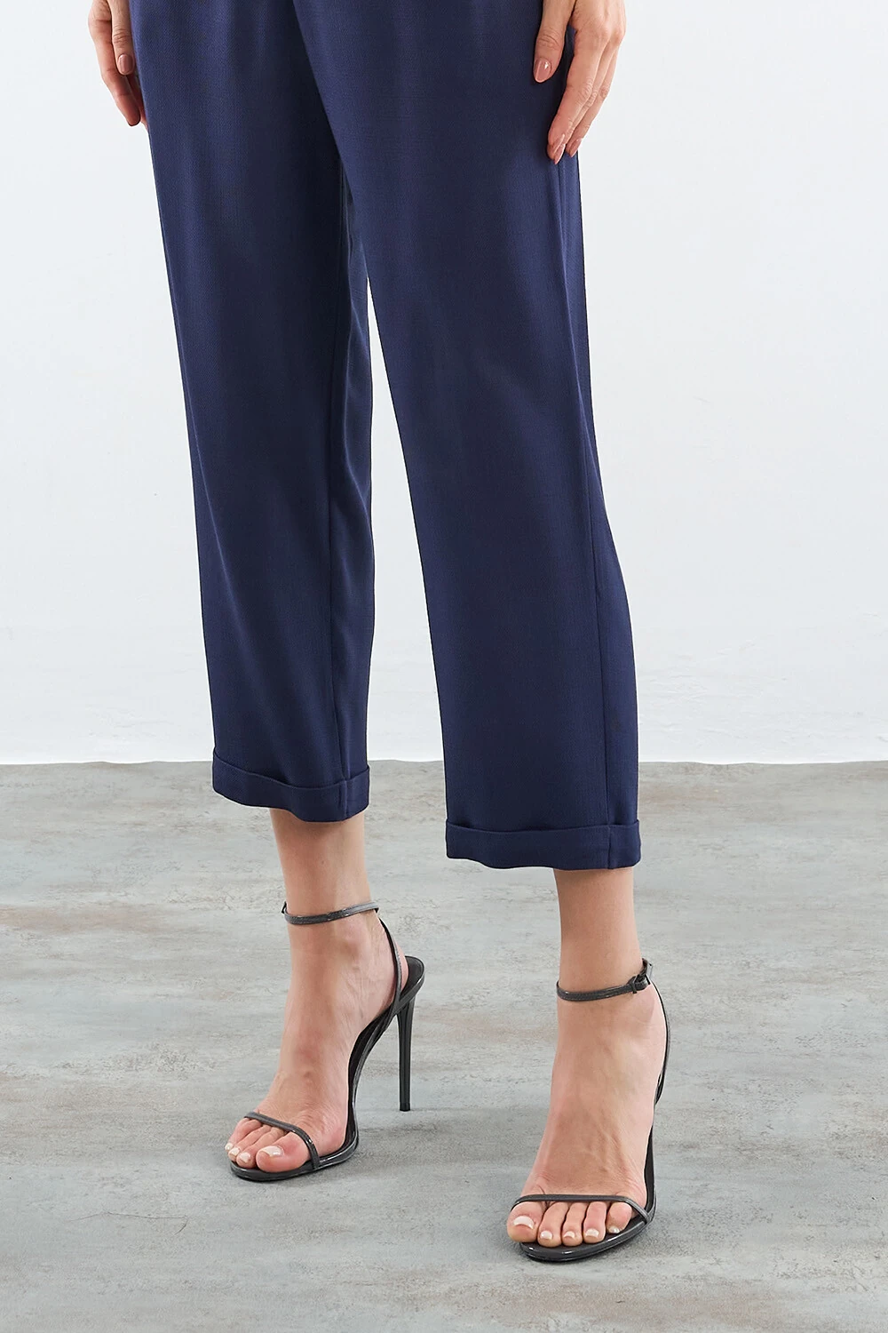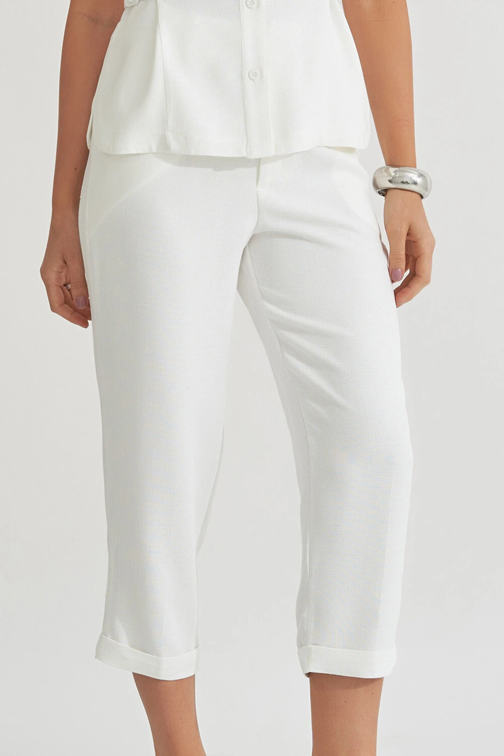 Calça confeccionada em tecido leve. A peça possui cintura alta, bolsos frontais e posteriores, shape cenoura, caimento reto, acabamento pespontado e fechamento frontal por zíper e botão.