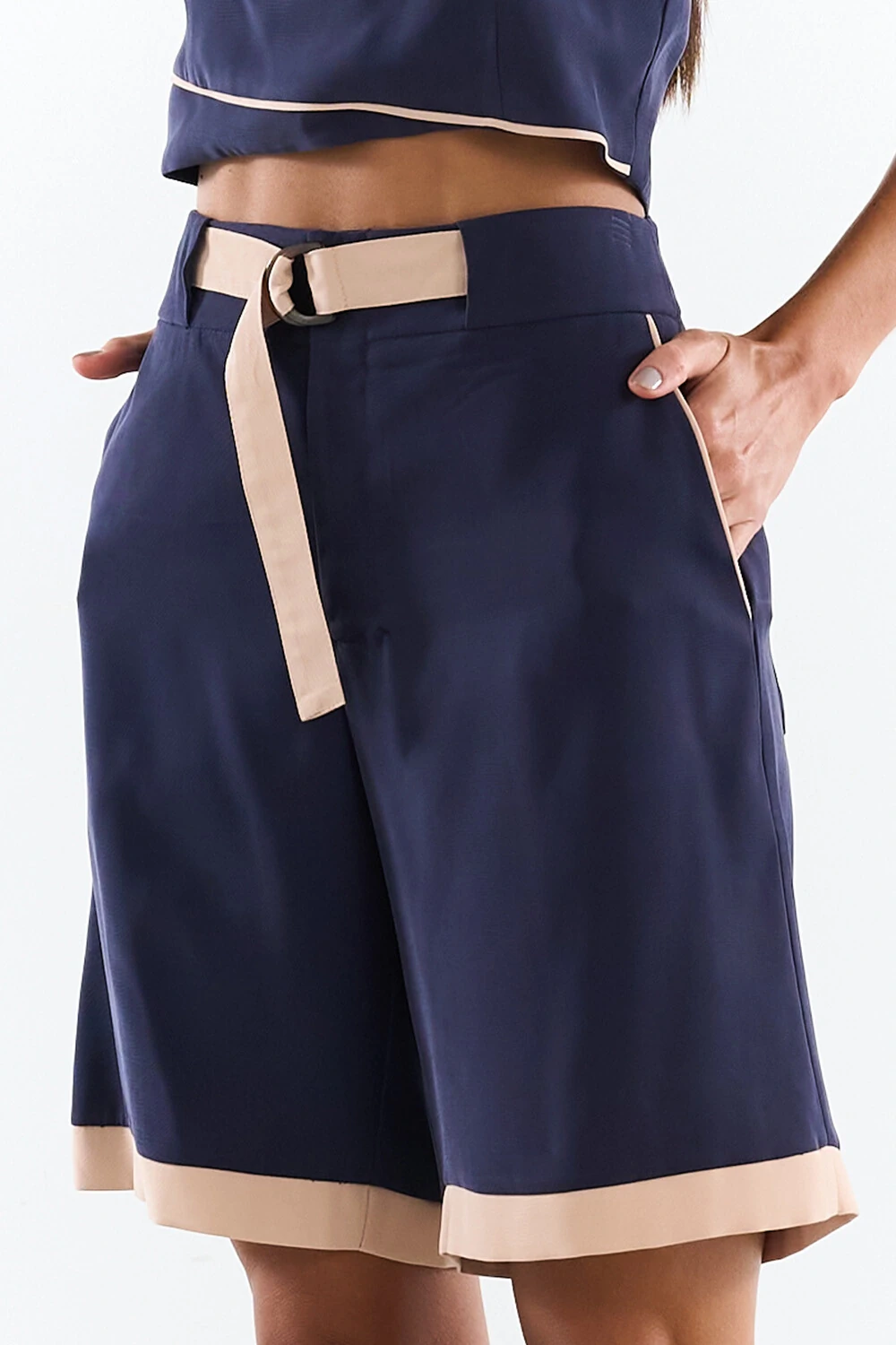 Bermuda confeccionada em tecido leve. A peça possui cintura alta com cinto aplicado, elástico aplicado na parte posterior, bolsos frontais e posteriores, detalhes nos bolsos e barra em contraste, acabamento pespontado e fechamento frontal por zíper.
