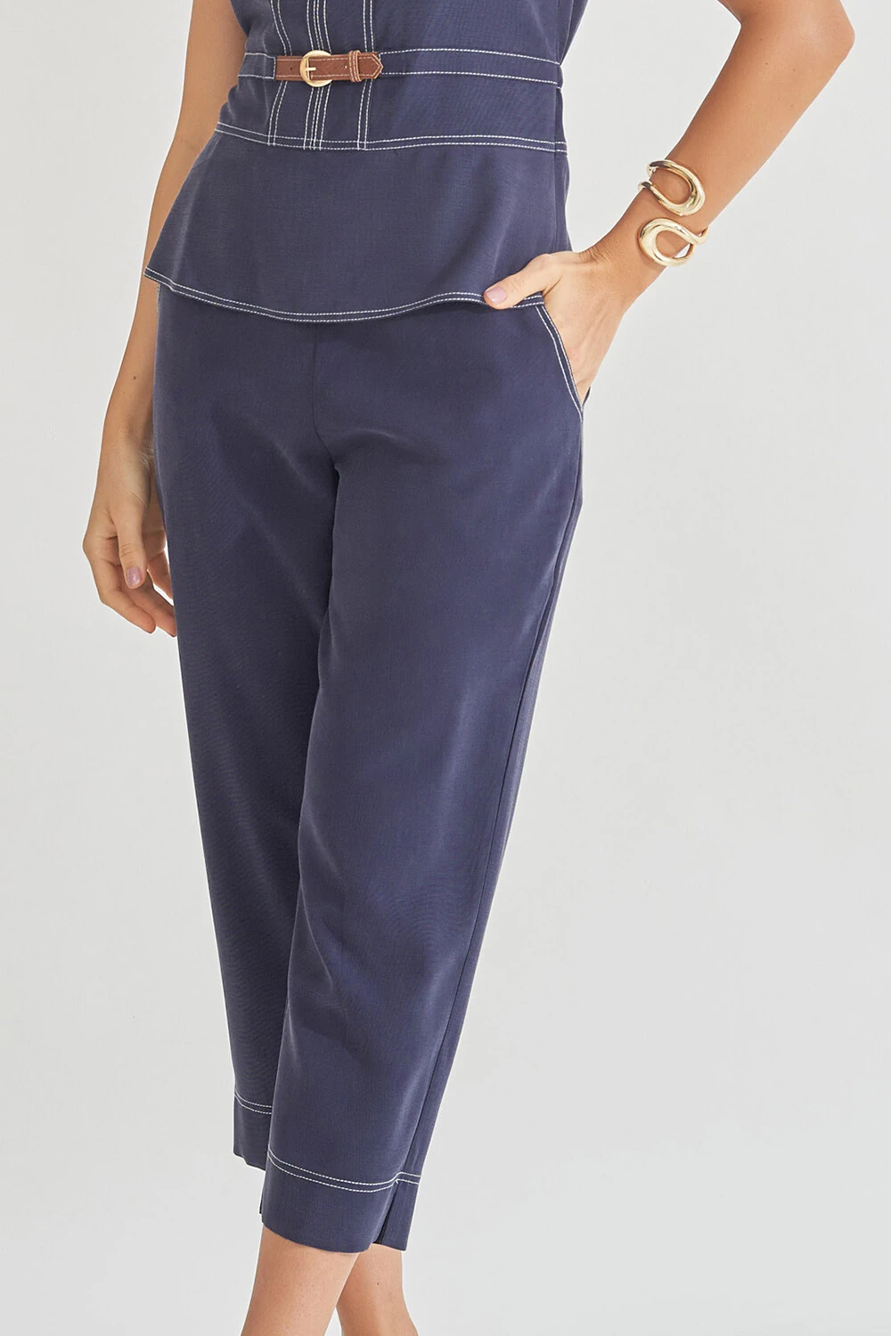 Regata confeccionada em tecido leve. A peça ajustada ao corpo possui decote “V”, alças largas, recortes frontais e posteriores, detalhe de aviamento aplicado na cintura, elástico aplicado na parte posterior da cintura, barra com acabamento peplum, acabamento pespontado em contraste e fechamento lateral por zíper invisível.