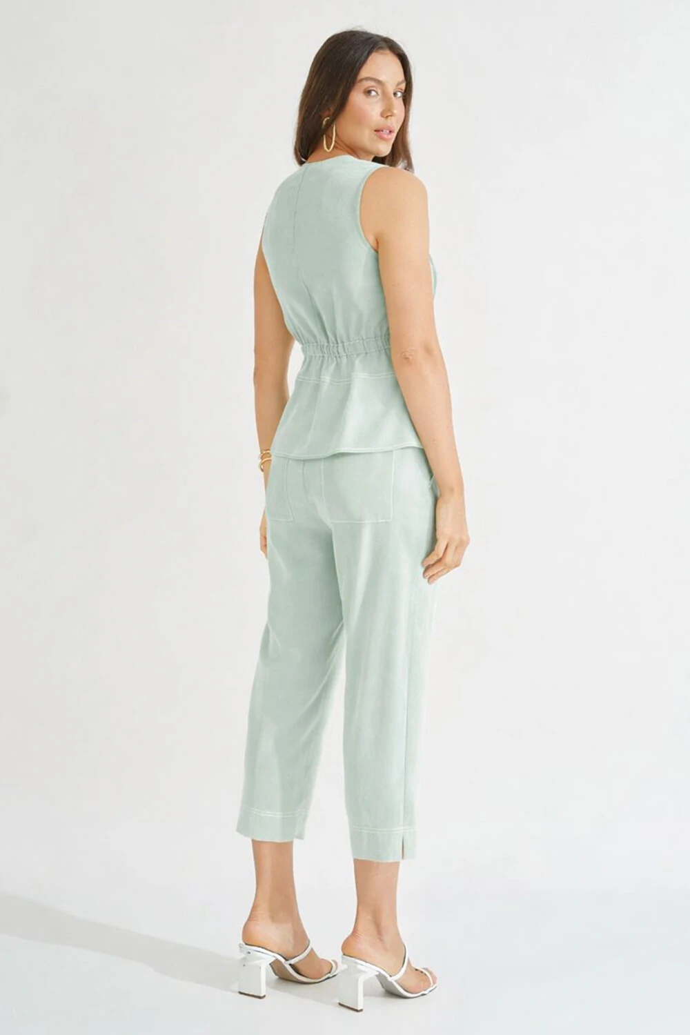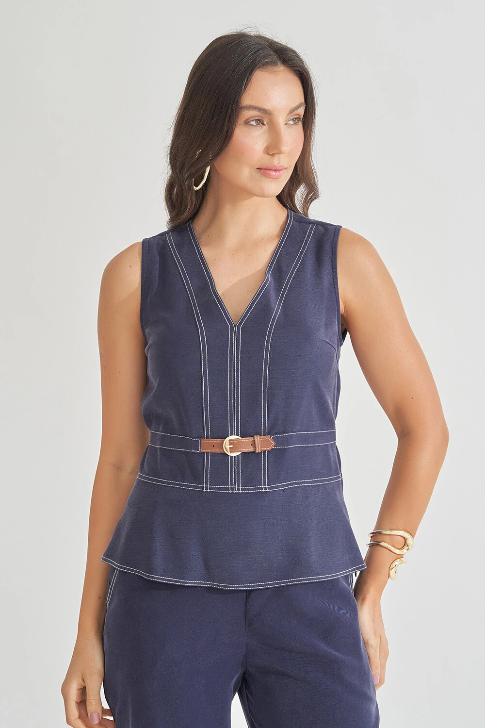Calça confeccionada em tecido leve. A peça possui cintura alta, bolsos frontais, bolsos posteriores, shape cenoura, pequena fenda lateral, acabamento pespontado em contraste e fechamento lateral por zíper.
