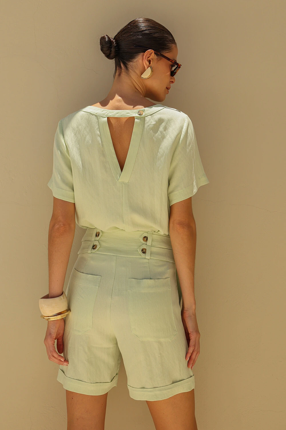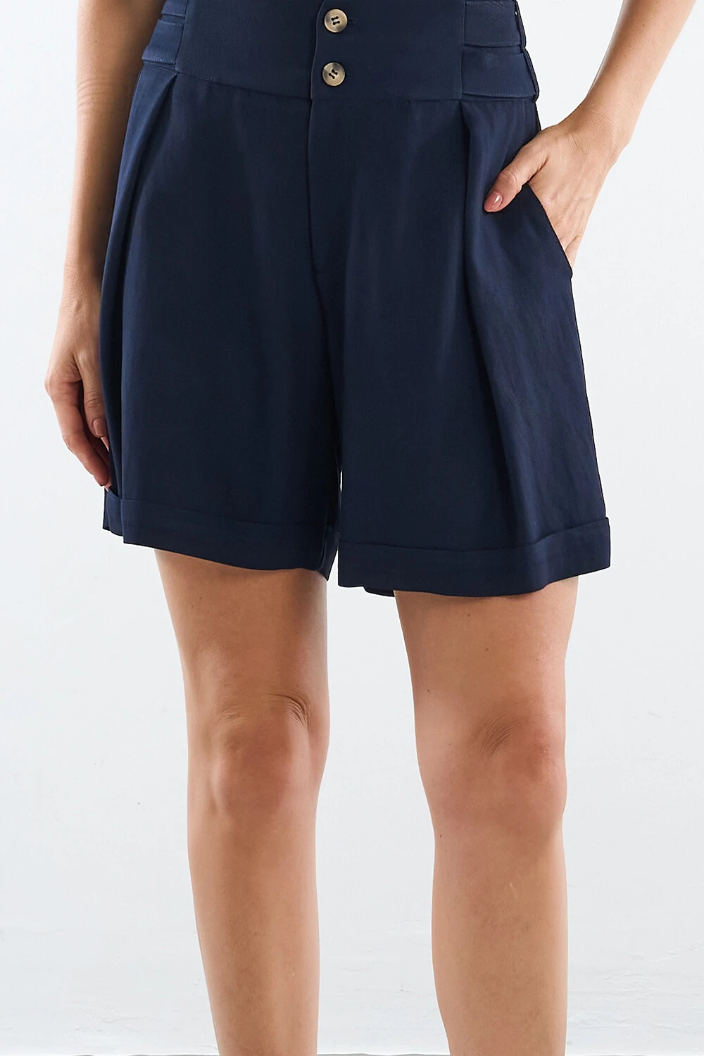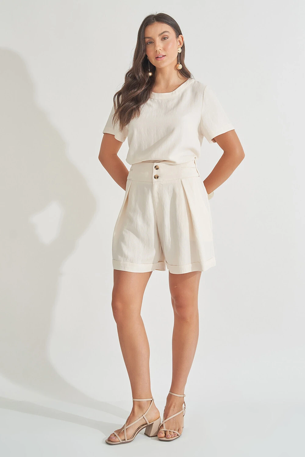 Bermuda confeccionada em tecido leve. A peça possui cintura alta, cós largo com detalhe de martingales e passantes aplicados, pequenas pregas frontais, bolsos frontais, bolsos posteriores, shape solto, caimento reto, acabamento pespontado e fechamento frontal por zíper e botões.