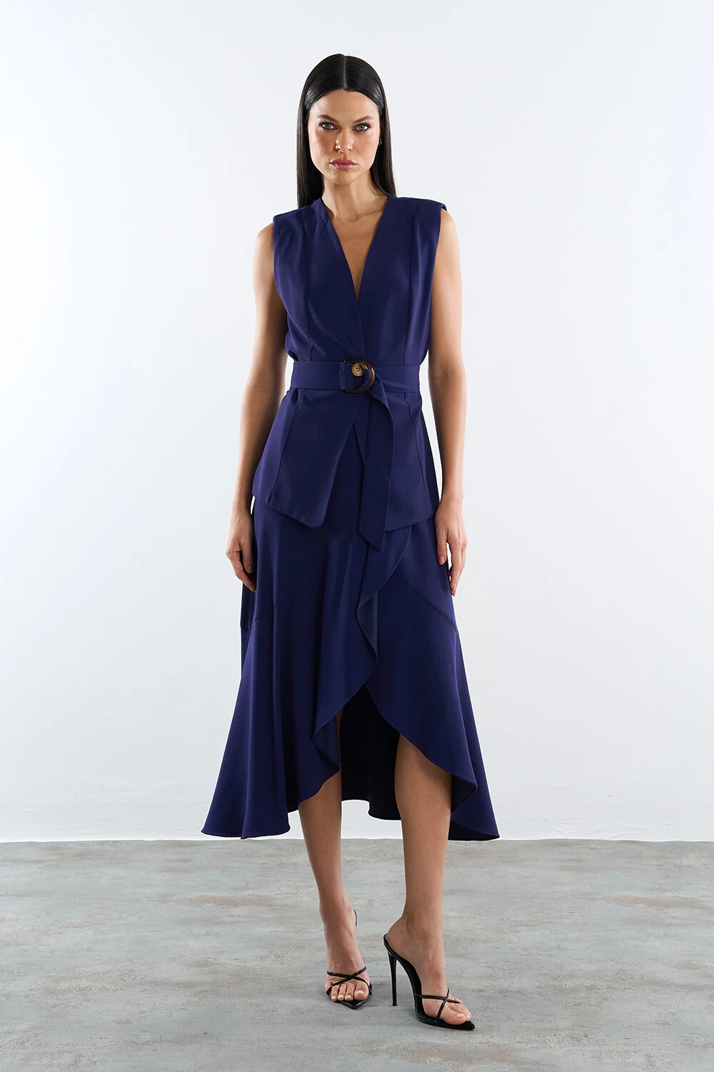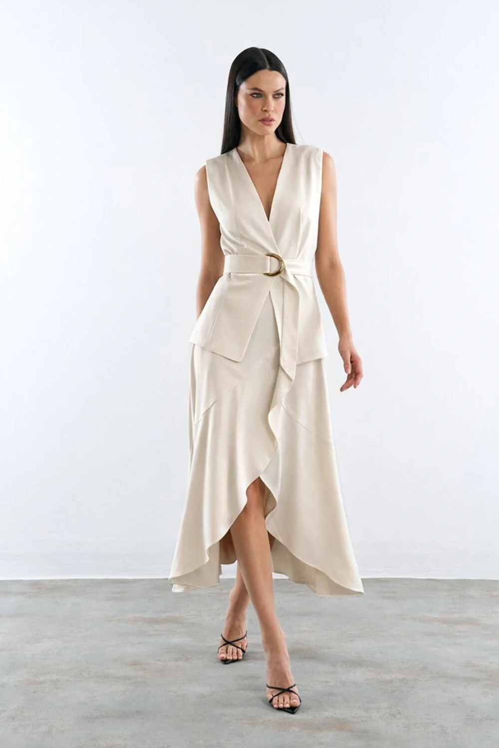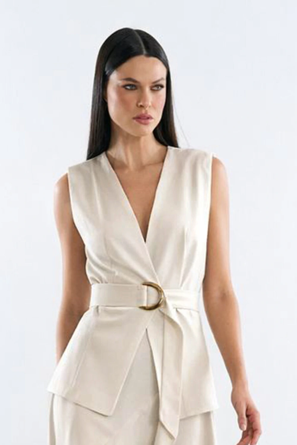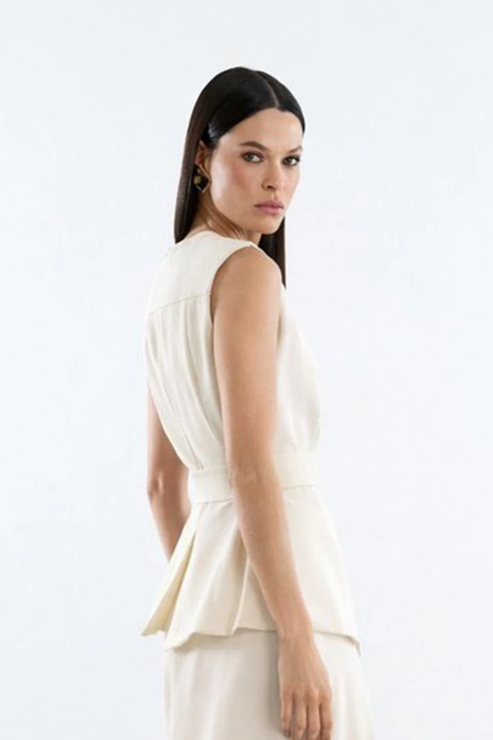 Colete confeccionado em tecido leve. A peça possui decote 'V", recortes frontais e posteriores, ombreiras aplicadas, forro, comprimento alongado, acabamento pespontado e fechamento frontal por botão. Acompanha cinto do próprio tecido com fivela tartaruga.