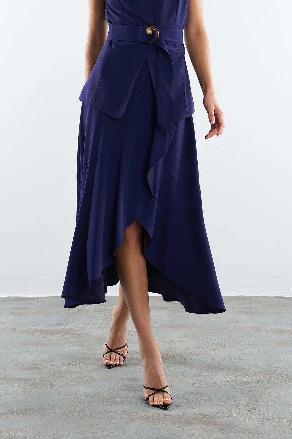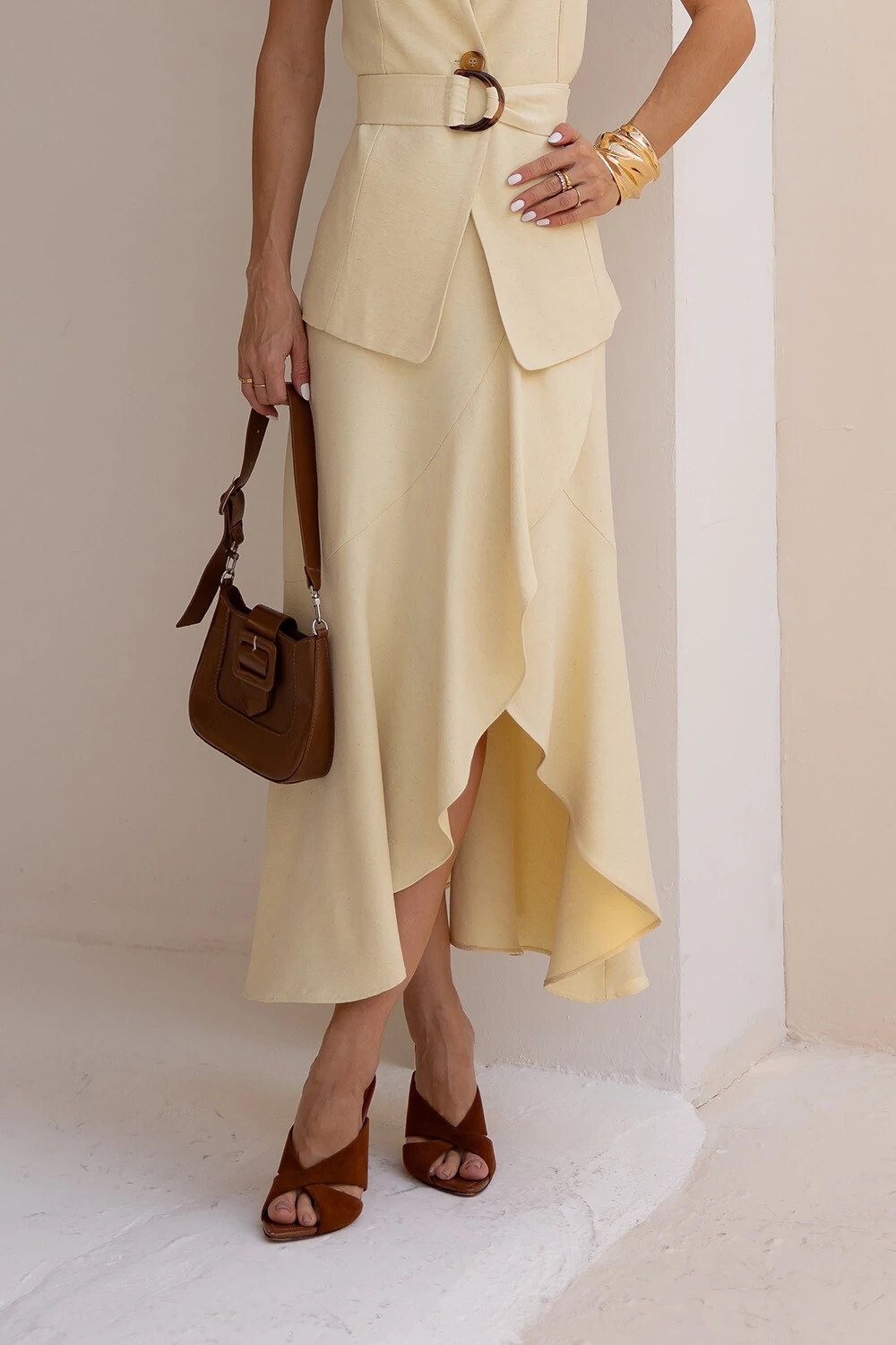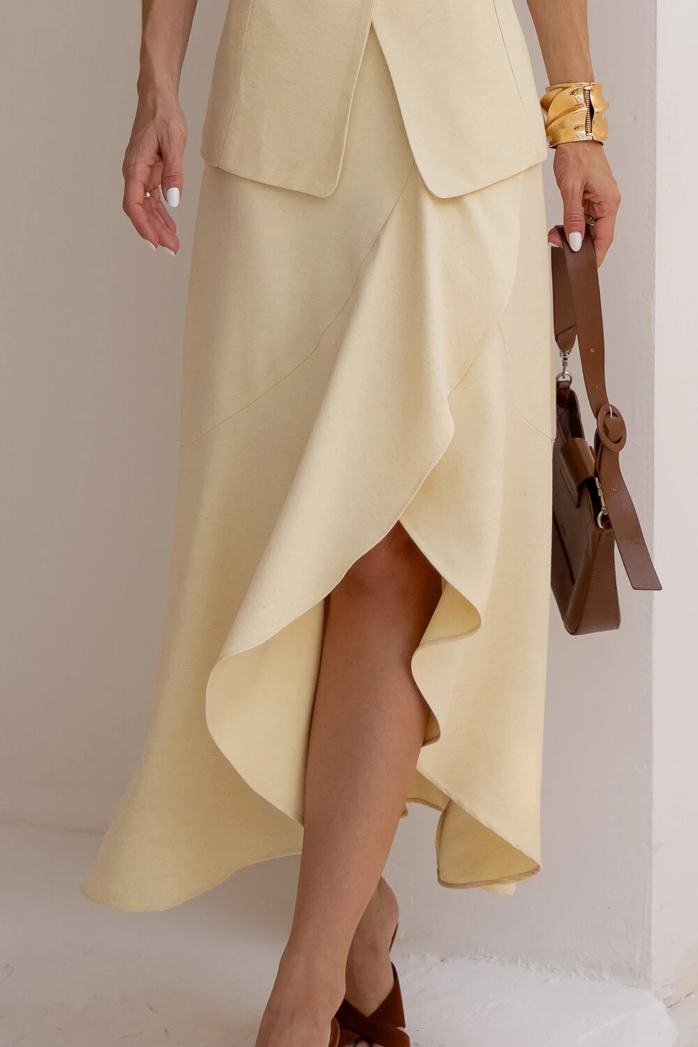 Saia confeccionada em tecido leve. A peça possui cintura alta, babado aplicado de forma assimétrica, comprimento midi, caimento levemente evasê, acabamento pespontado e fechamento lateral por zíper.