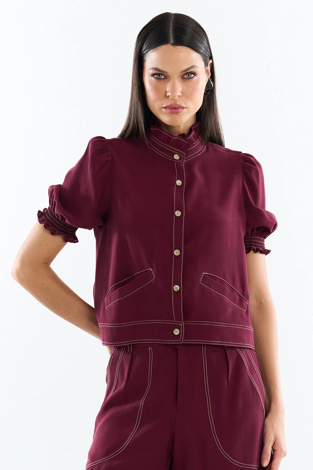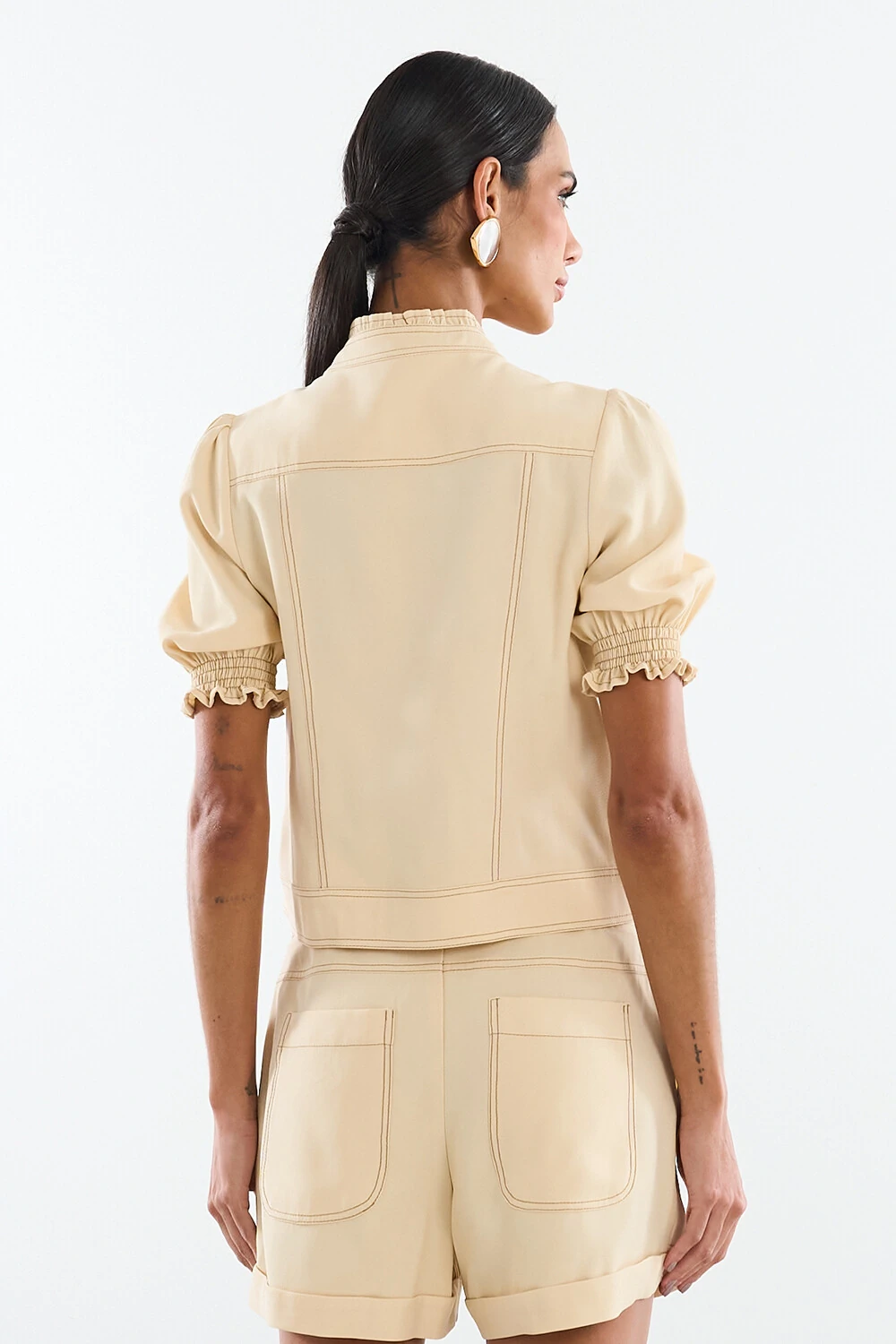 Camisa confeccionada em tecido leve. A peça possui gola alta com babados aplicados, mangas curtas com lastex nos punhos, recortes posteriores, caimento reto, barra aplicada, acabamento pespontado em contraste e fechamento frontal por botões.