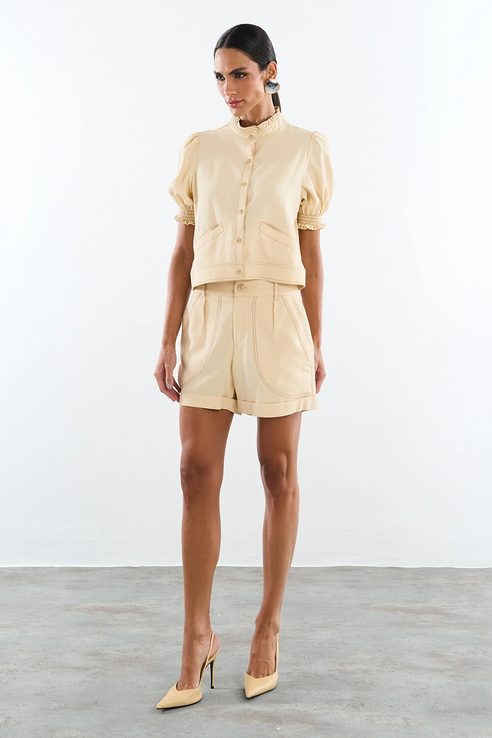 Shorts confeccionado em tecido leve. A peça possui cintura alta, cós com passantes aplicados, bolsos frontais, bolsos posteriores, acabamento pespontado em contraste e fechamento frontal por zíper e botão.