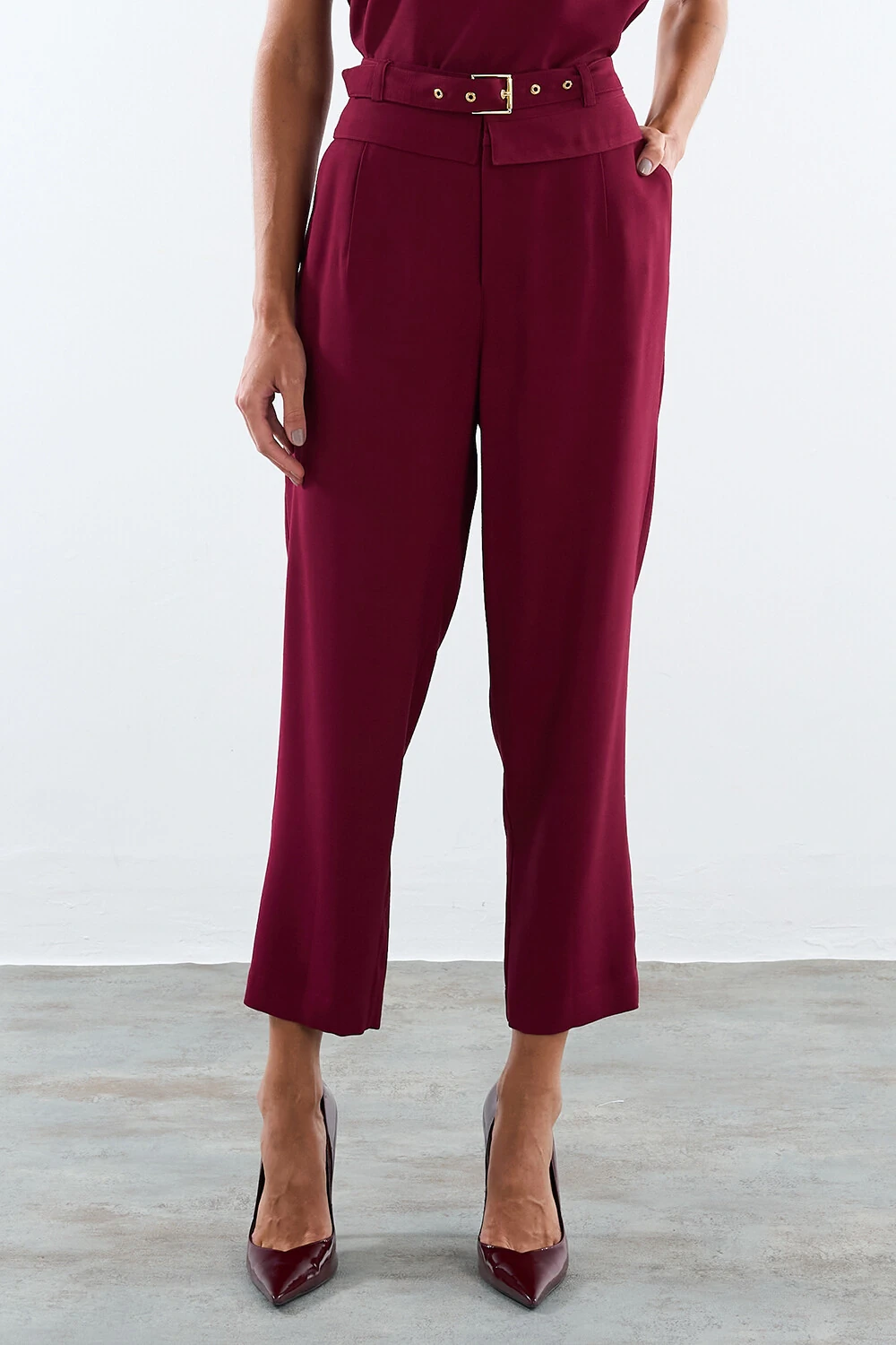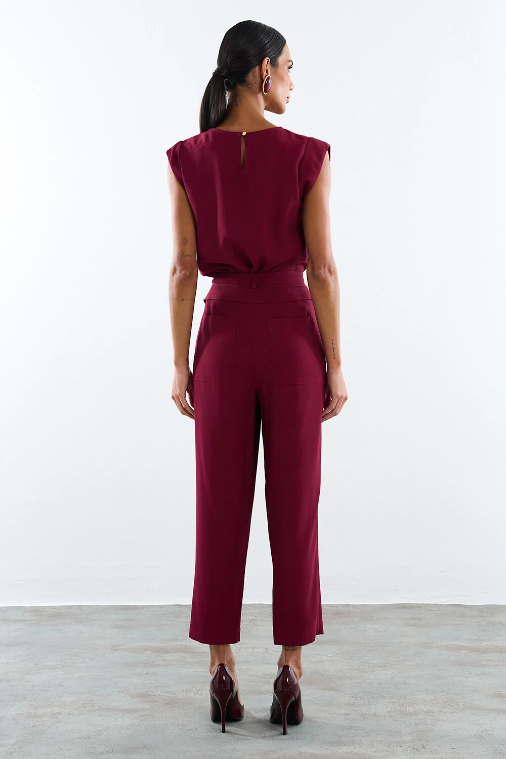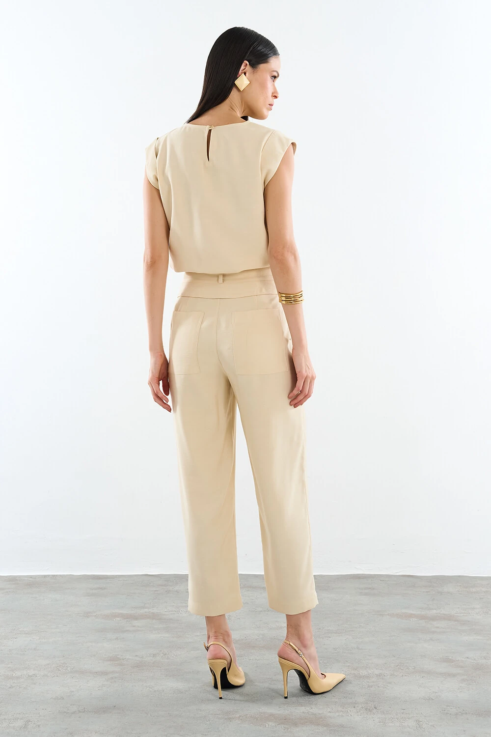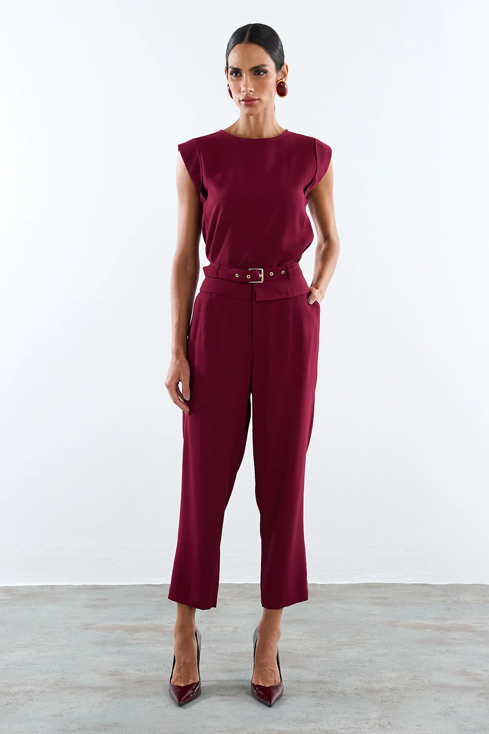 Calça confeccionada em tecido leve. A peça possui cintura alta, pala aplicada, bolsos frontais e posteriores, pequenas pregas frontais, shape cenoura, caimento reto, acabamento pespontado e fechamento frontal por zíper. Acompanha cinto do próprio tecido.