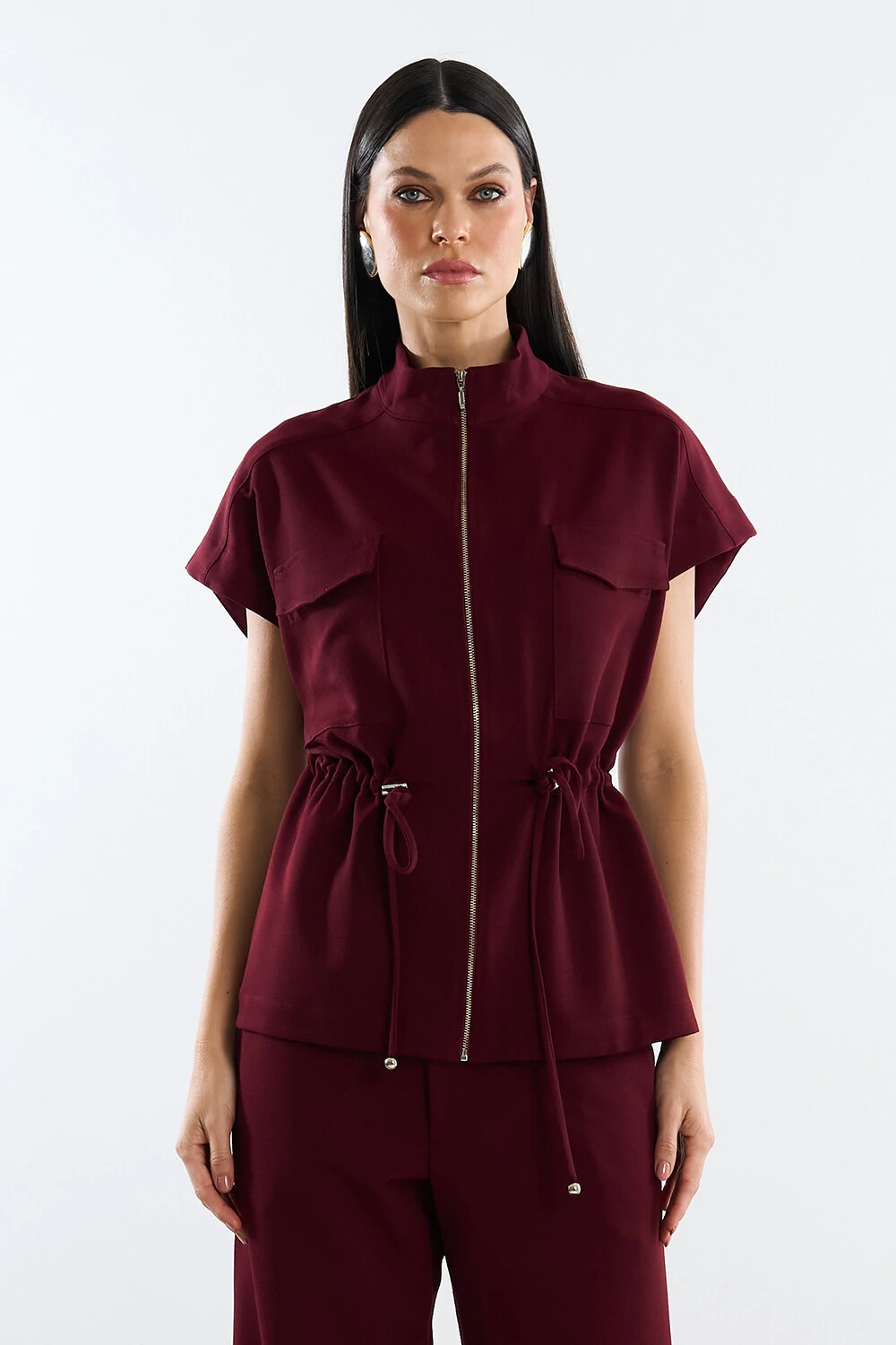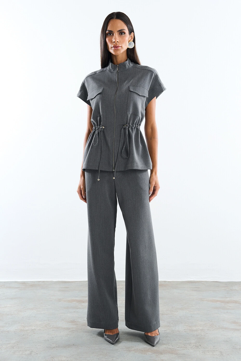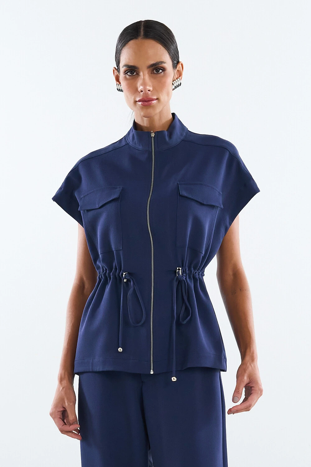 Parka confeccionada em tecido encorpado. A peça possui gola alta, ombros estendidos com recortes, bolsos frontais com lapela. canaleta na cintura com cordão para amarração, shape solto, caimento reto, acabamento pespontado e fechamento frontal por zíper metálico.