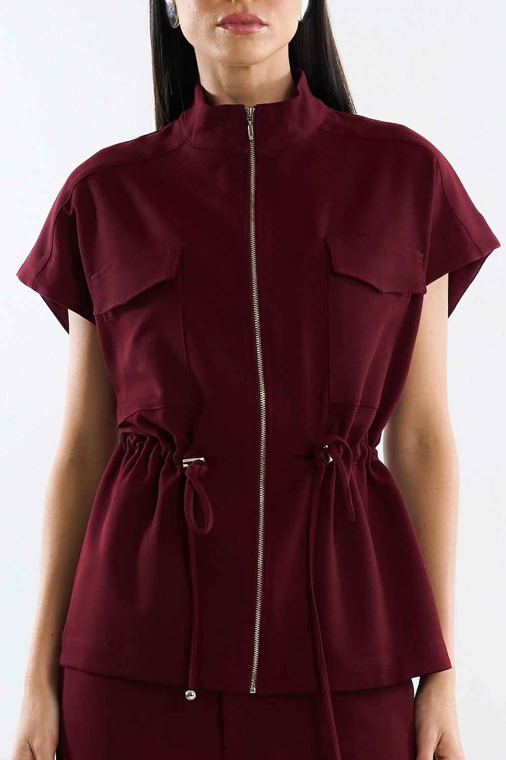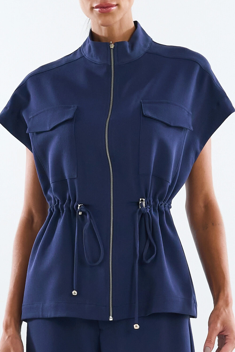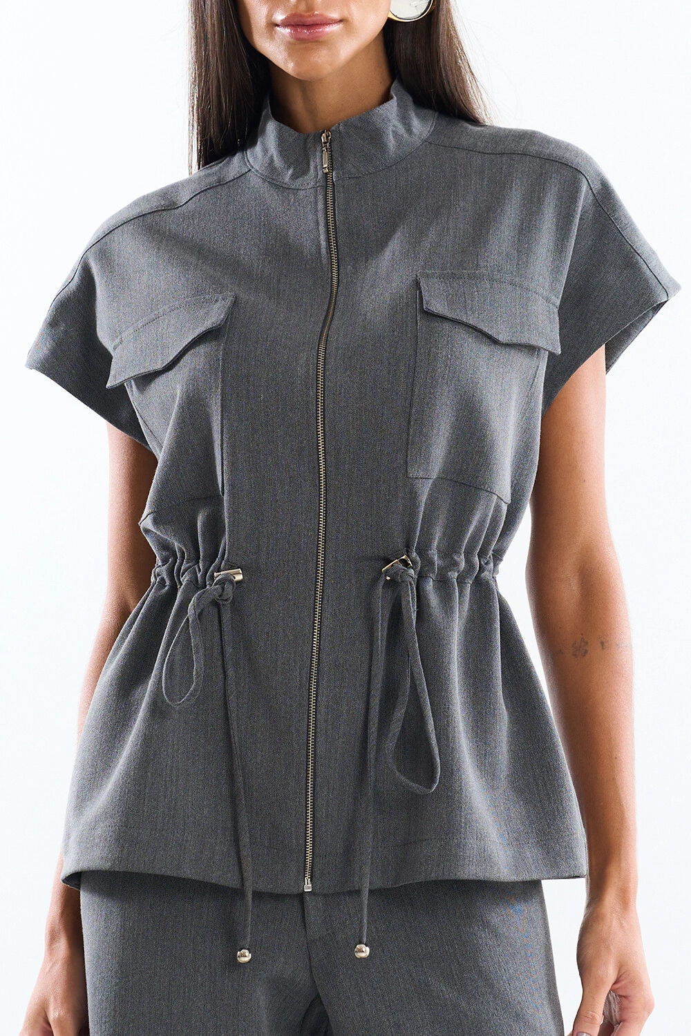 Parka confeccionada em tecido encorpado. A peça possui gola alta, ombros estendidos com recortes, bolsos frontais com lapela. canaleta na cintura com cordão para amarração, shape solto, caimento reto, acabamento pespontado e fechamento frontal por zíper metálico.