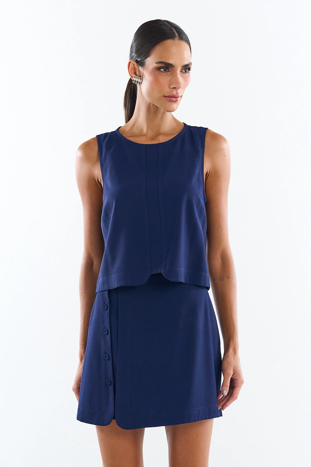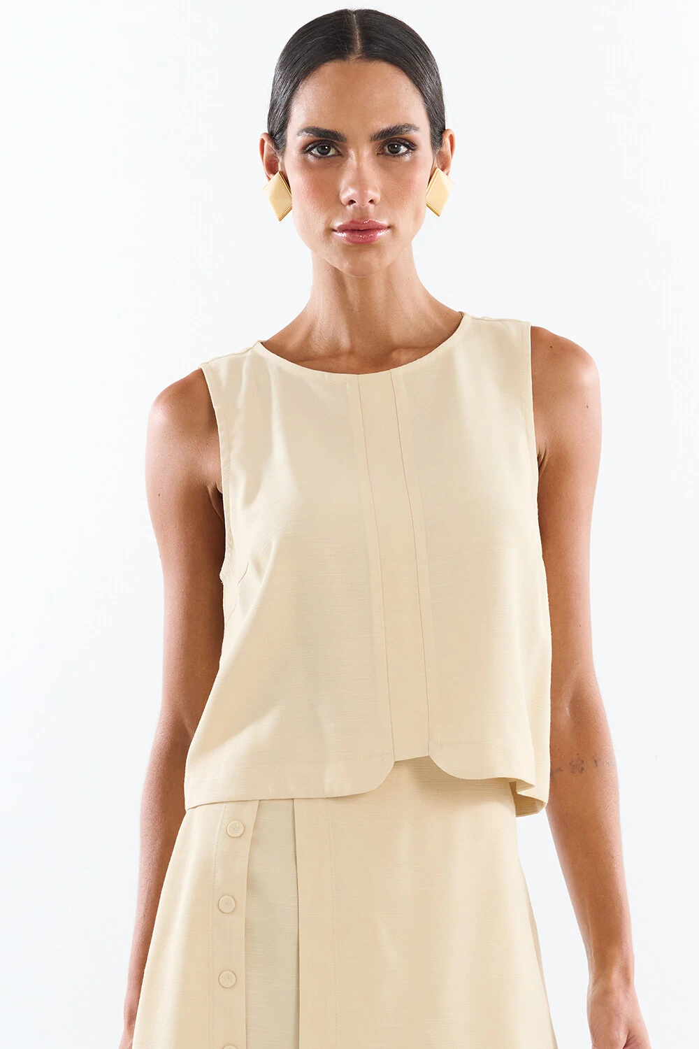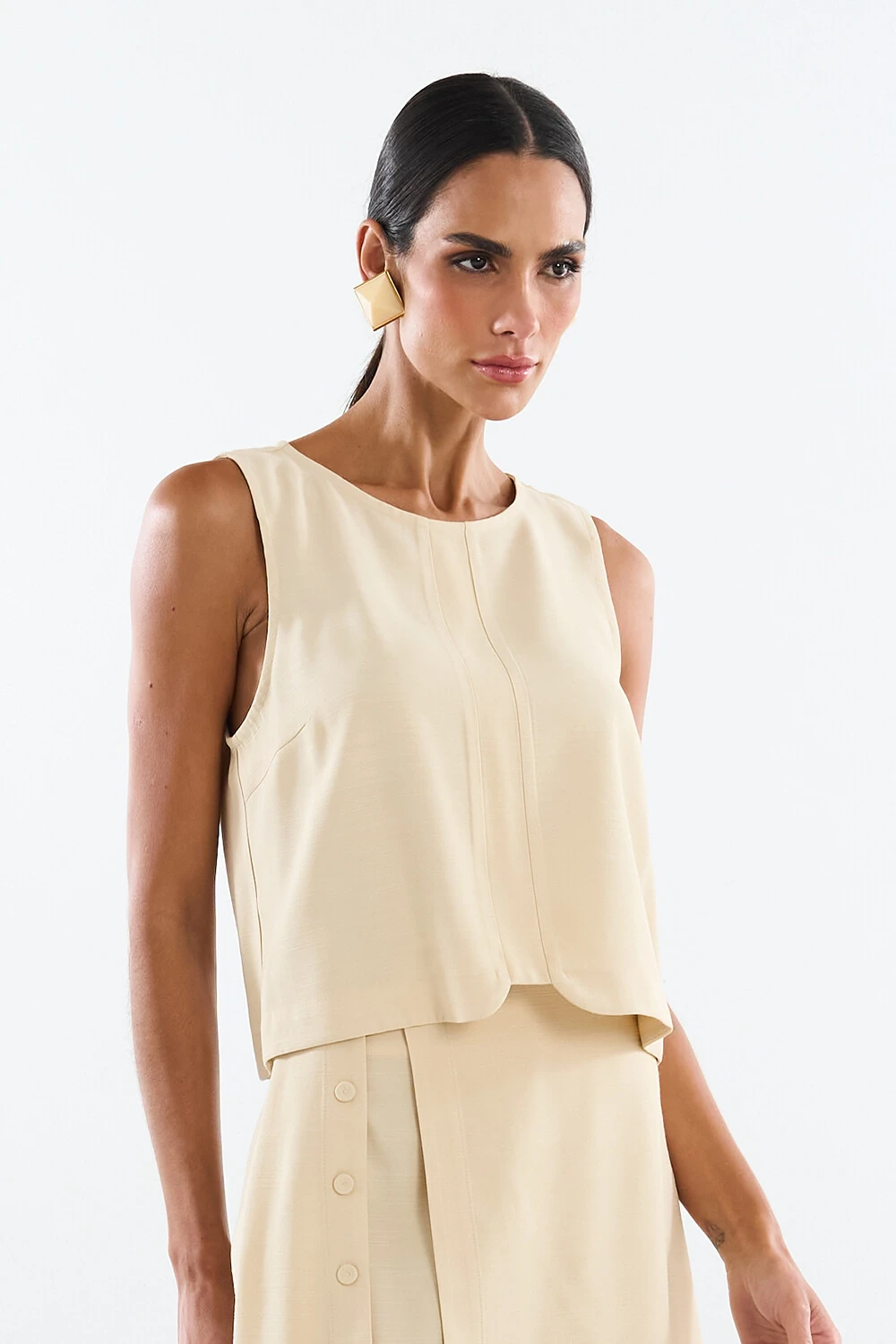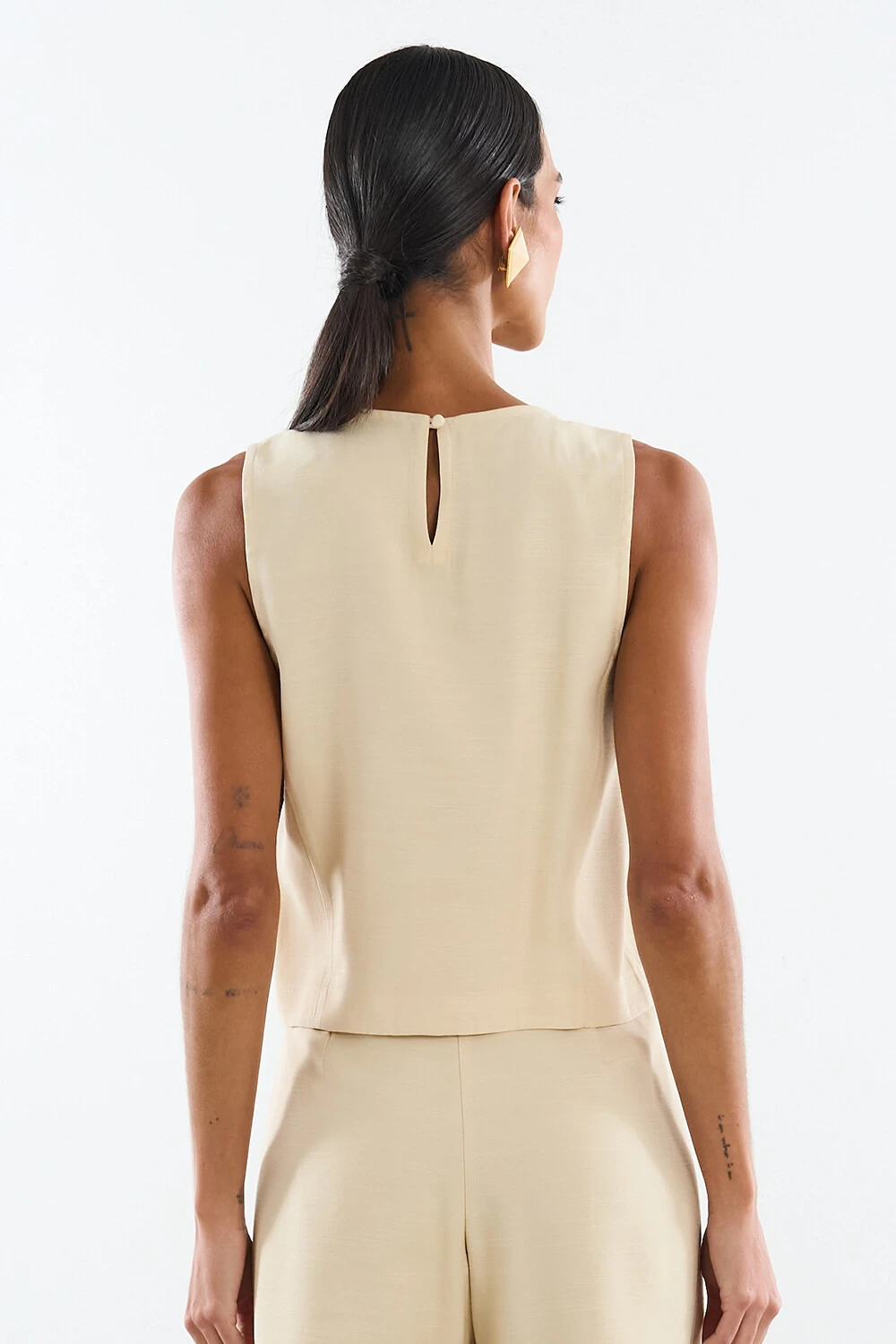 Regata confeccionada em tecido leve. A peça possui decote redondo, cavas regulares, recortes frontais, acabamento pespontado e fechamento posterior por botão.
