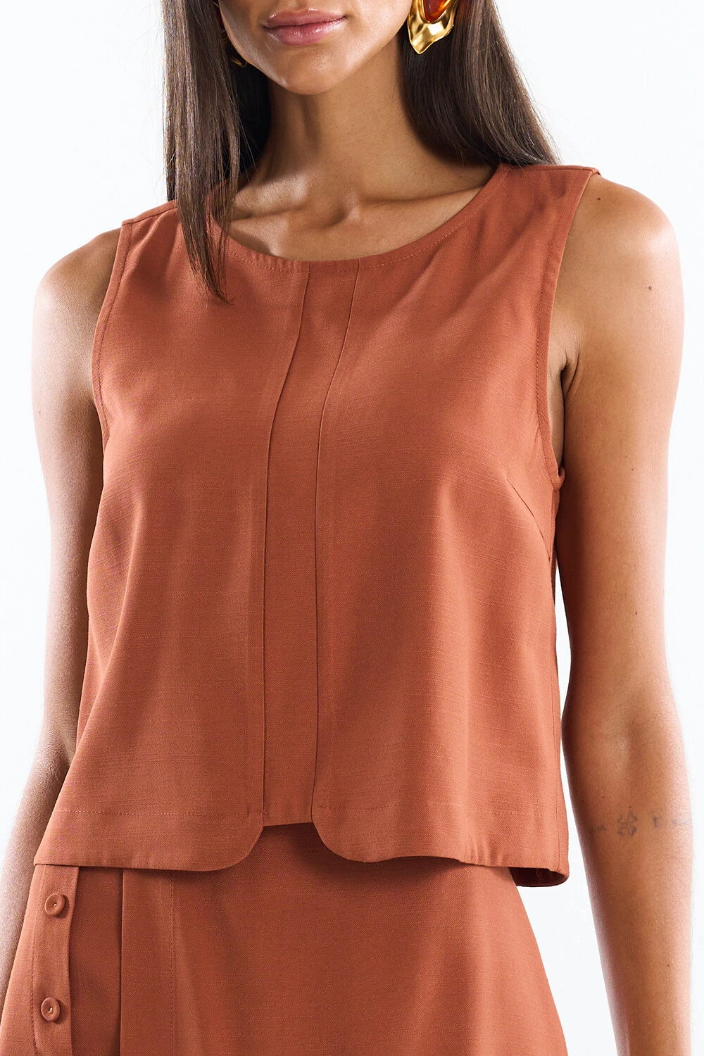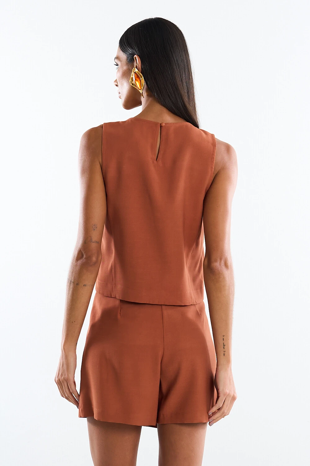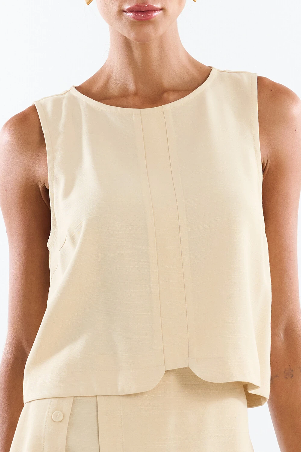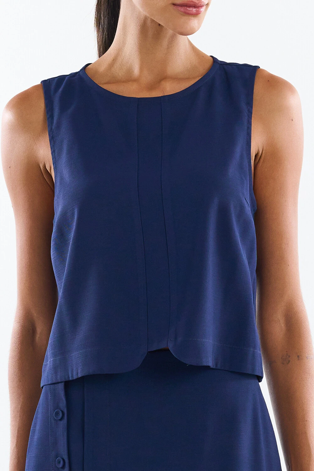 Regata confeccionada em tecido leve. A peça possui decote redondo, cavas regulares, recortes frontais, acabamento pespontado e fechamento posterior por botão.