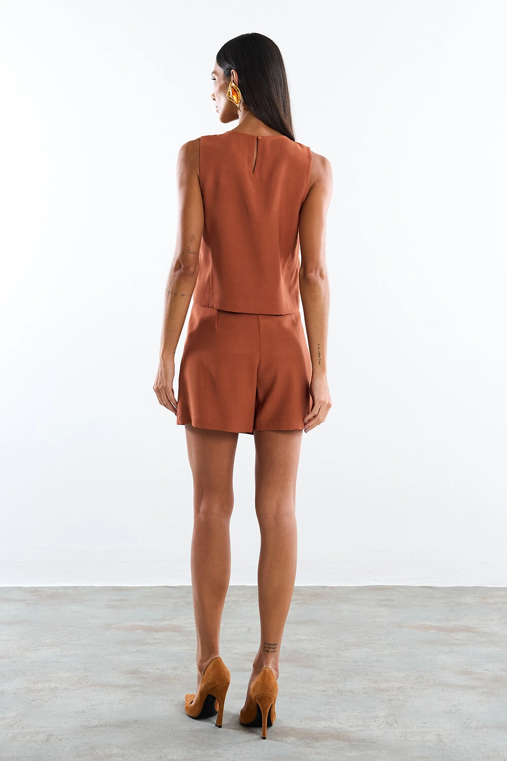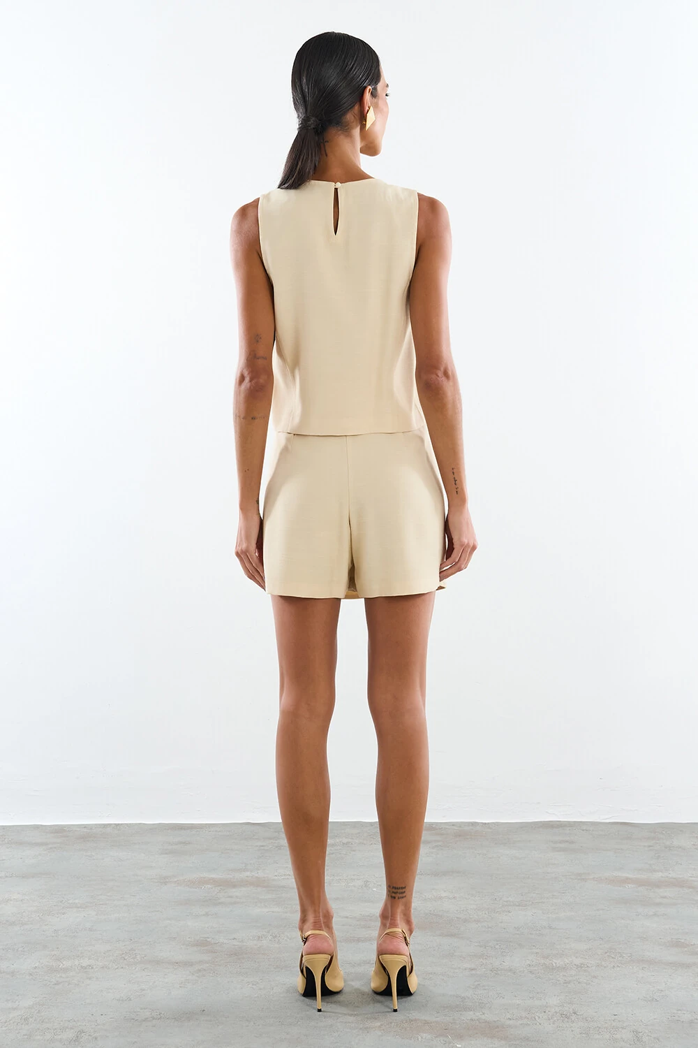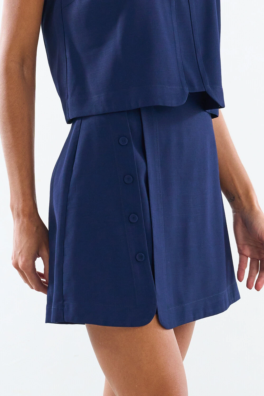 Short saia confeccionado em tecido leve. A peça possui cintura alta, botões forrados aplicados na lateral, shape solto, caimento reto, acabamento pespontado e fechamento lateral por zíper invisível.