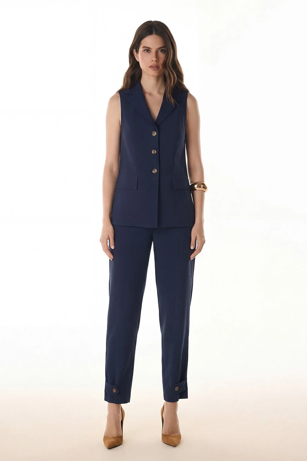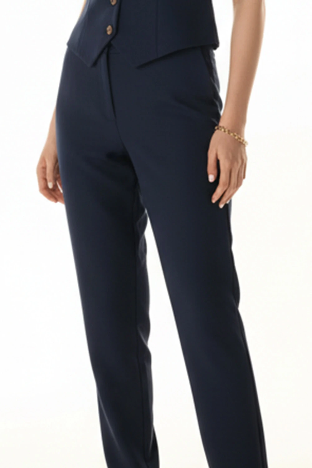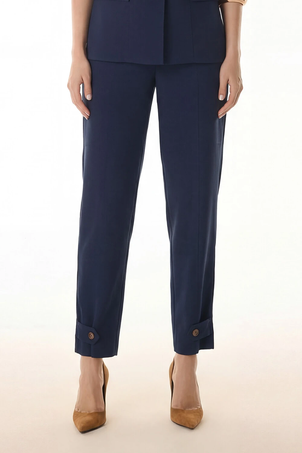 Calça confeccionada em tecido leve. A peça possui cintura alta, recortes frontais, bolsos frontais com lapela, bolsos posteriores, shape cenoura, detalhe de martingale na barra com fechamento por botão, caimento reto, acabamento pespontado e fechamento frontal por zíper e botão.