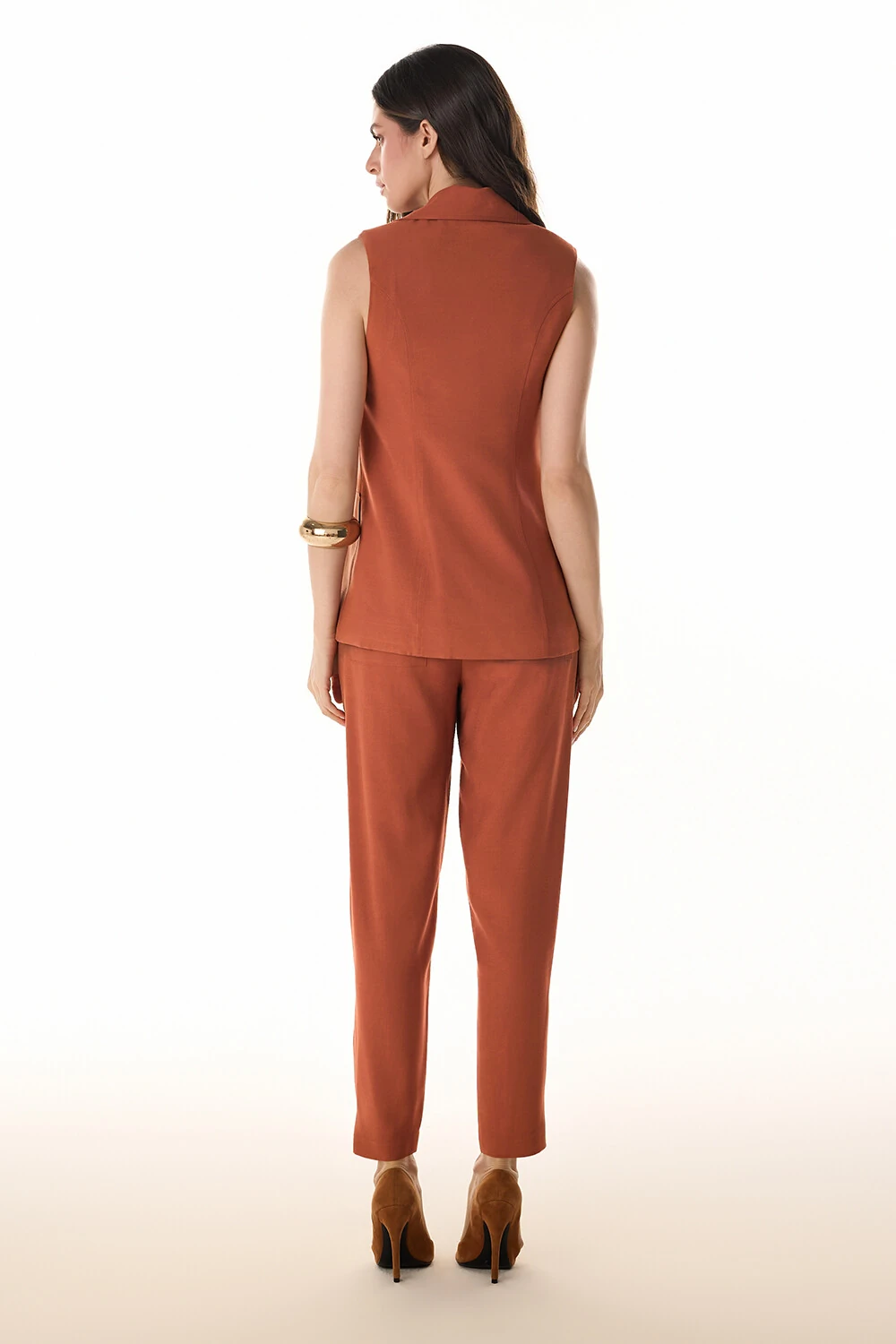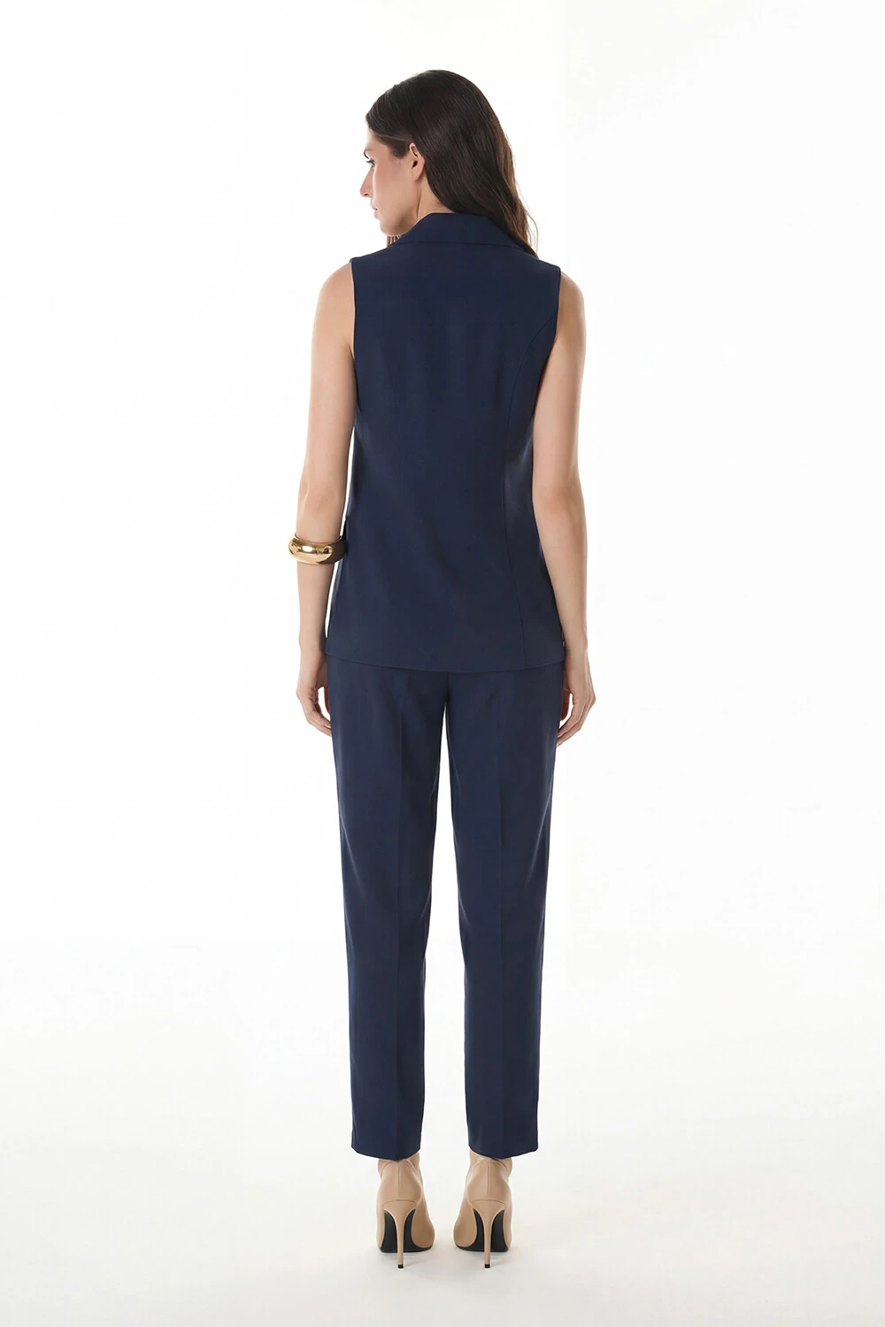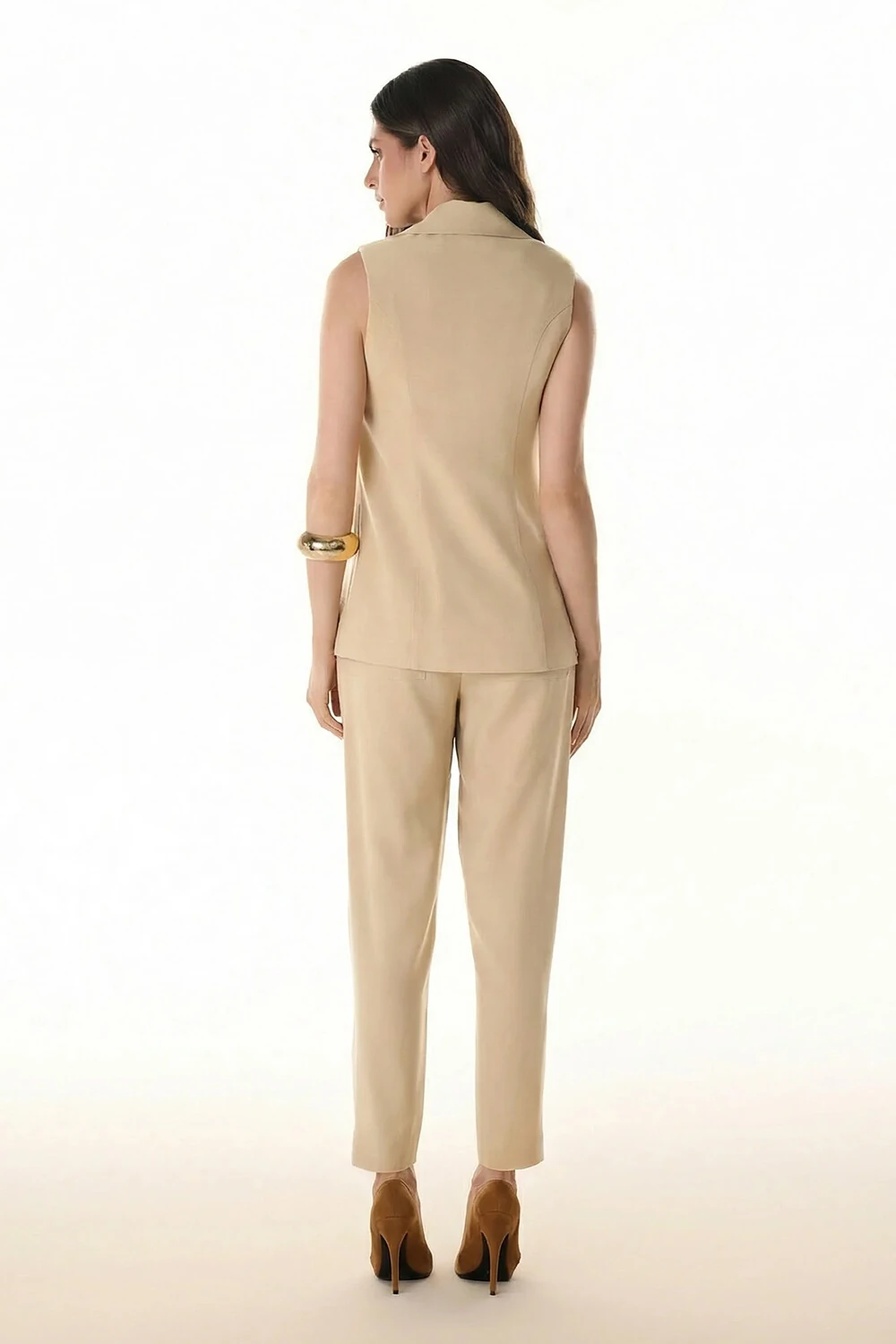 Calça confeccionada em tecido leve. A peça possui cintura alta, recortes frontais, bolsos frontais com lapela, bolsos posteriores, shape cenoura, detalhe de martingale na barra com fechamento por botão, caimento reto, acabamento pespontado e fechamento frontal por zíper e botão.