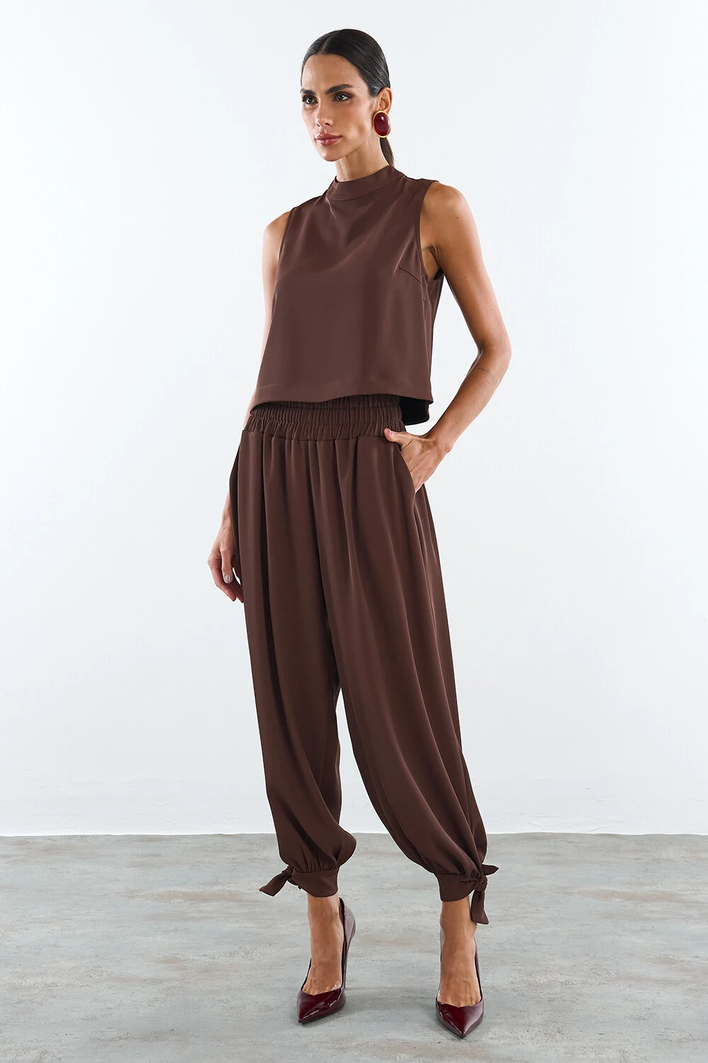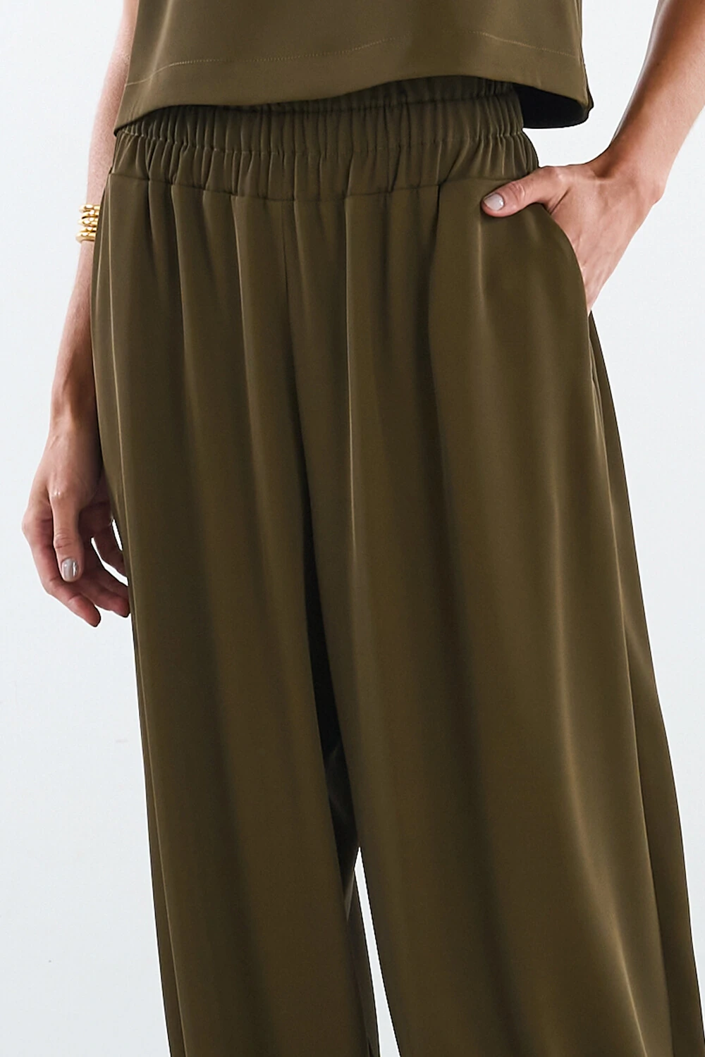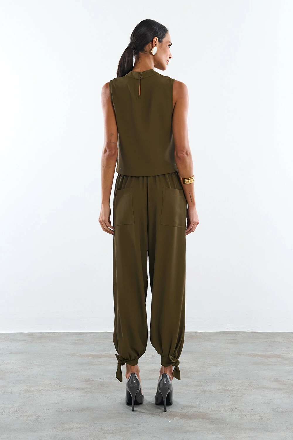 Calça confeccionada em tecido leve. A peça possui cintura alta, cós com elástico aplicado, bolsos frontais, bolsos posteriores, shape solto, punho com amarração e acabamento pespontado.