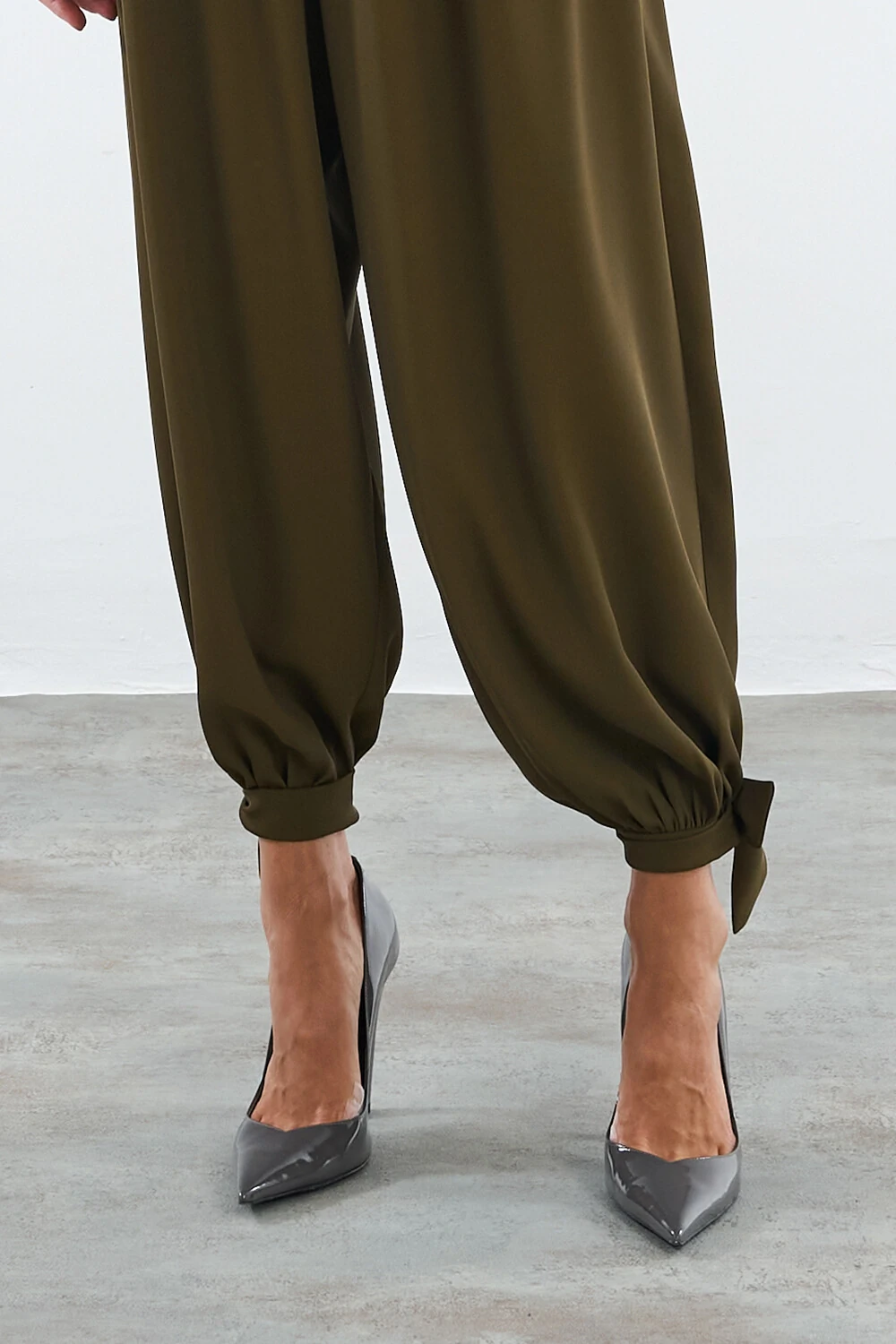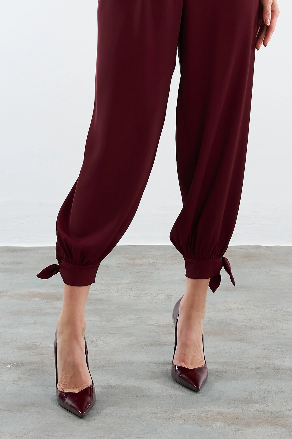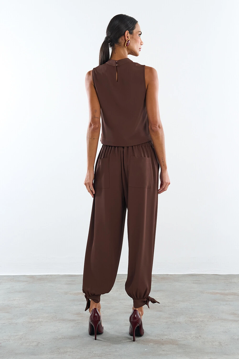 Calça confeccionada em tecido leve. A peça possui cintura alta, cós com elástico aplicado, bolsos frontais, bolsos posteriores, shape solto, punho com amarração e acabamento pespontado.