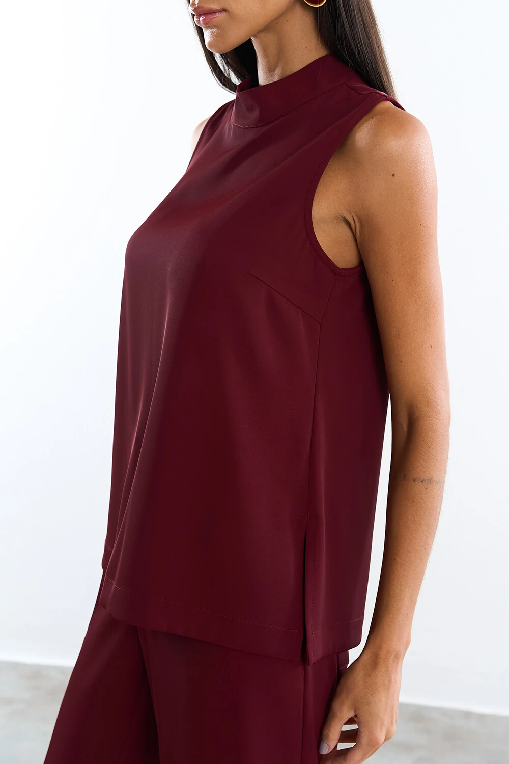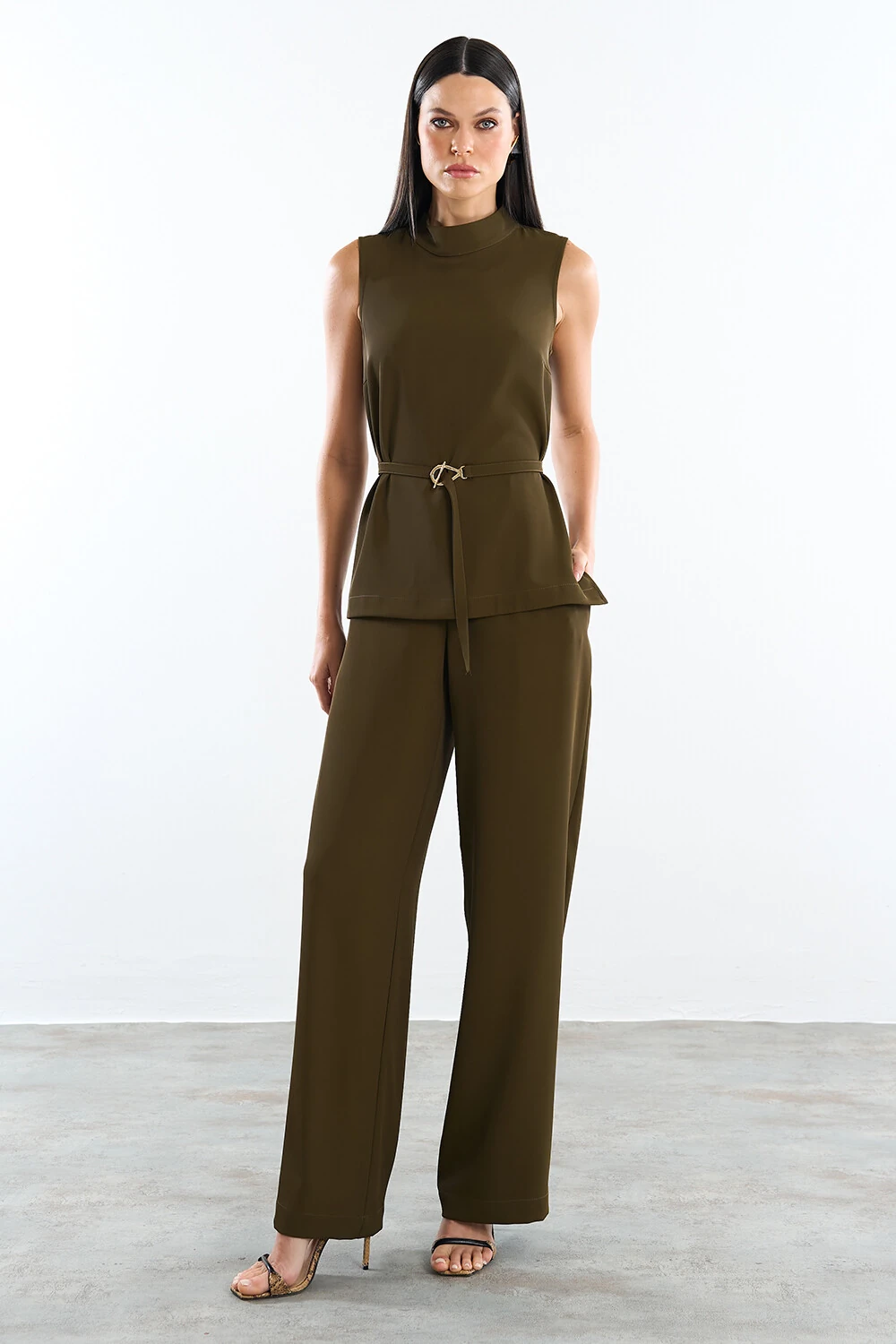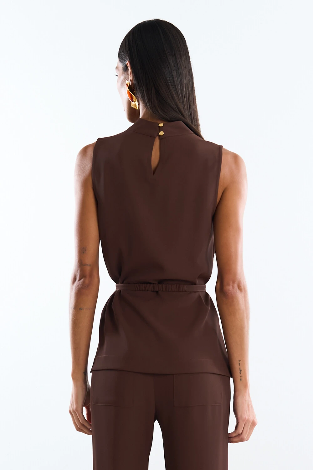 Regata confeccionada em tecido leve. A peça possui decote redondo, alças largas, cavas regulares, fendas laterais, shape solto, caimento reto, acabamento pespontado e fechamento posterior por botões dourados. Acompanha cinto do próprio tecido com fivela dourada.