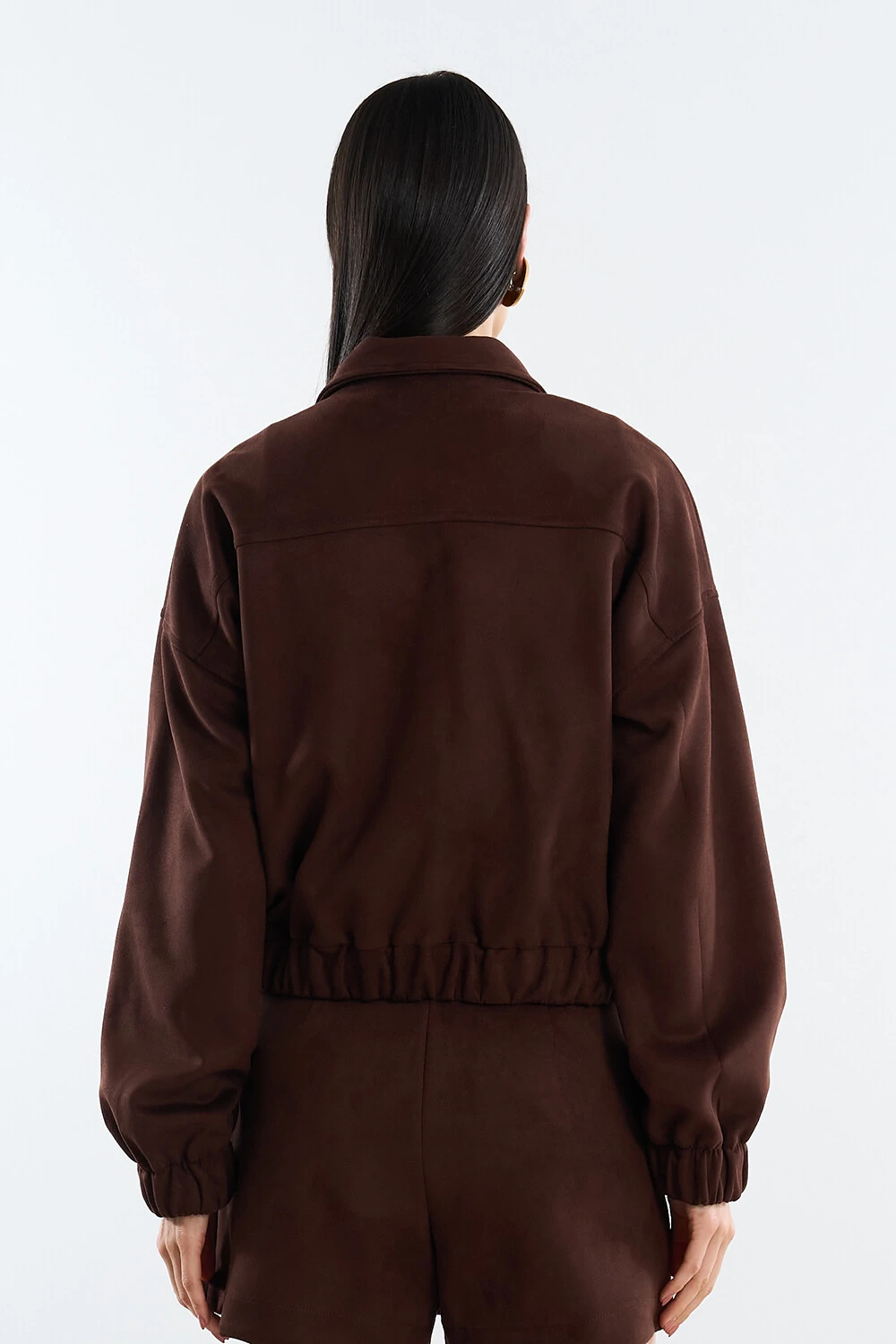 Jaqueta confeccionada em tecido encorpado. A peça possui colarinho clássico, vista frontal com fechamento por botões de pressão, bolsos frontais, mangas longas com elástico aplicado nos punhos, recorte posterior, shape solto, elástico aplicado na barra, forro, acabamento pespontado e fechamento frontal por zíper metálico.