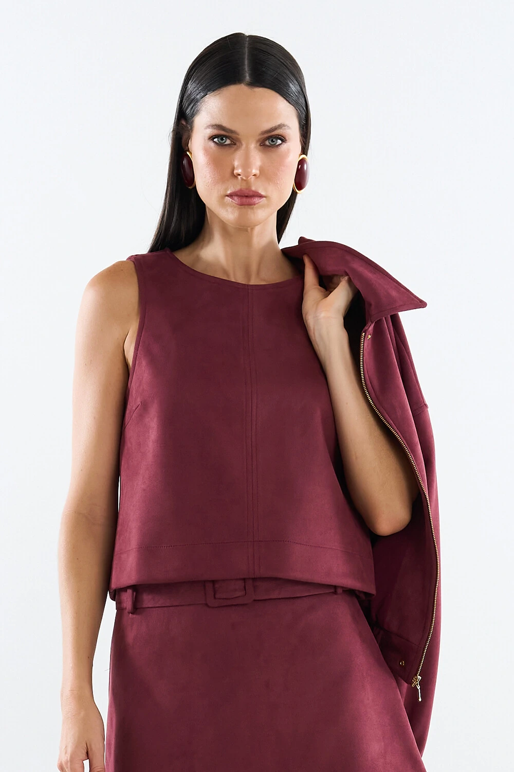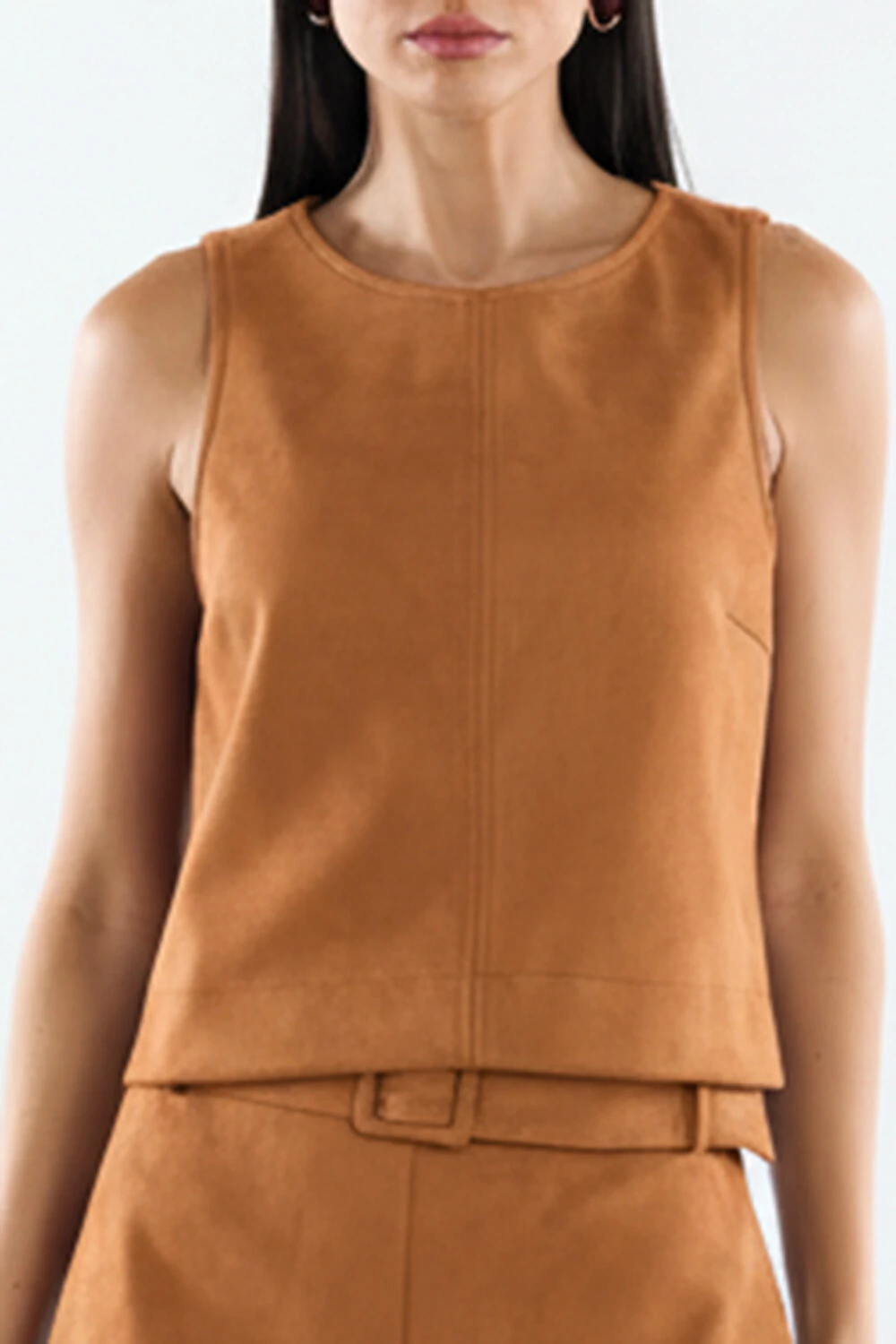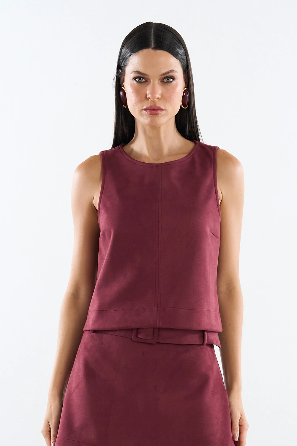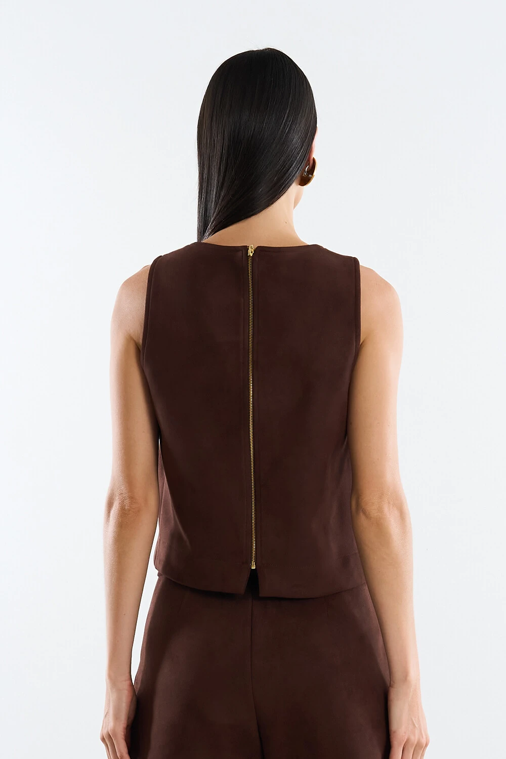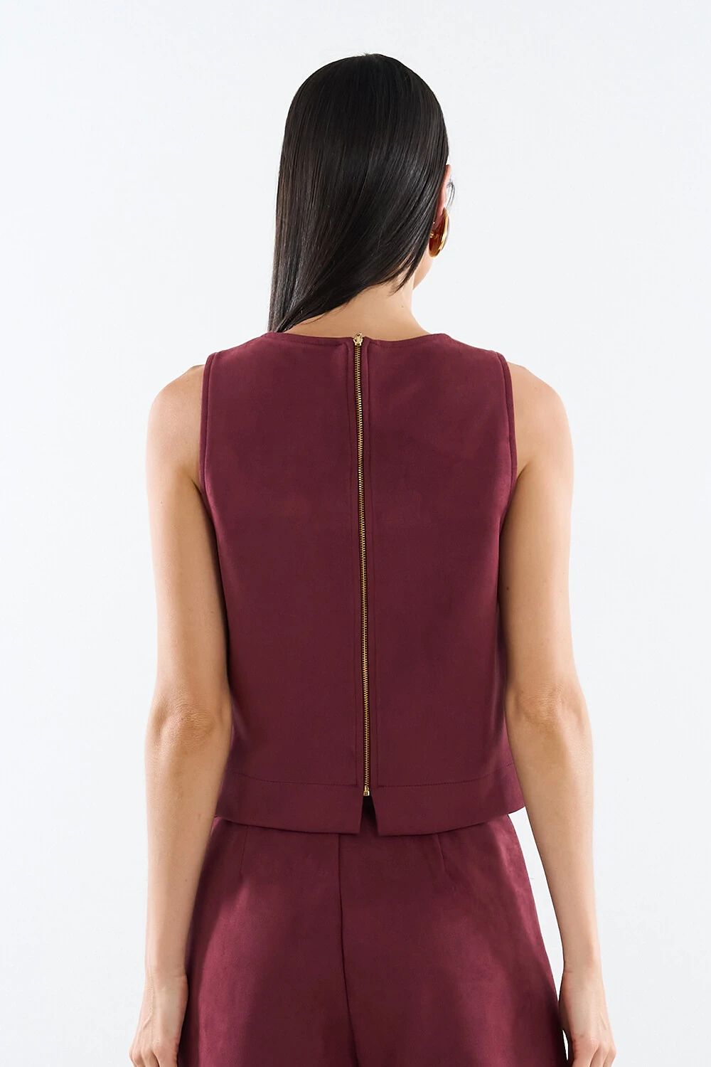 Regata confeccionada em tecido encorpado. A peça possui decote redondo, cavas regulares, recortes frontais, pequenas fendas laterais, acabamento pespontado e fechamento posterior por zíper metálico.