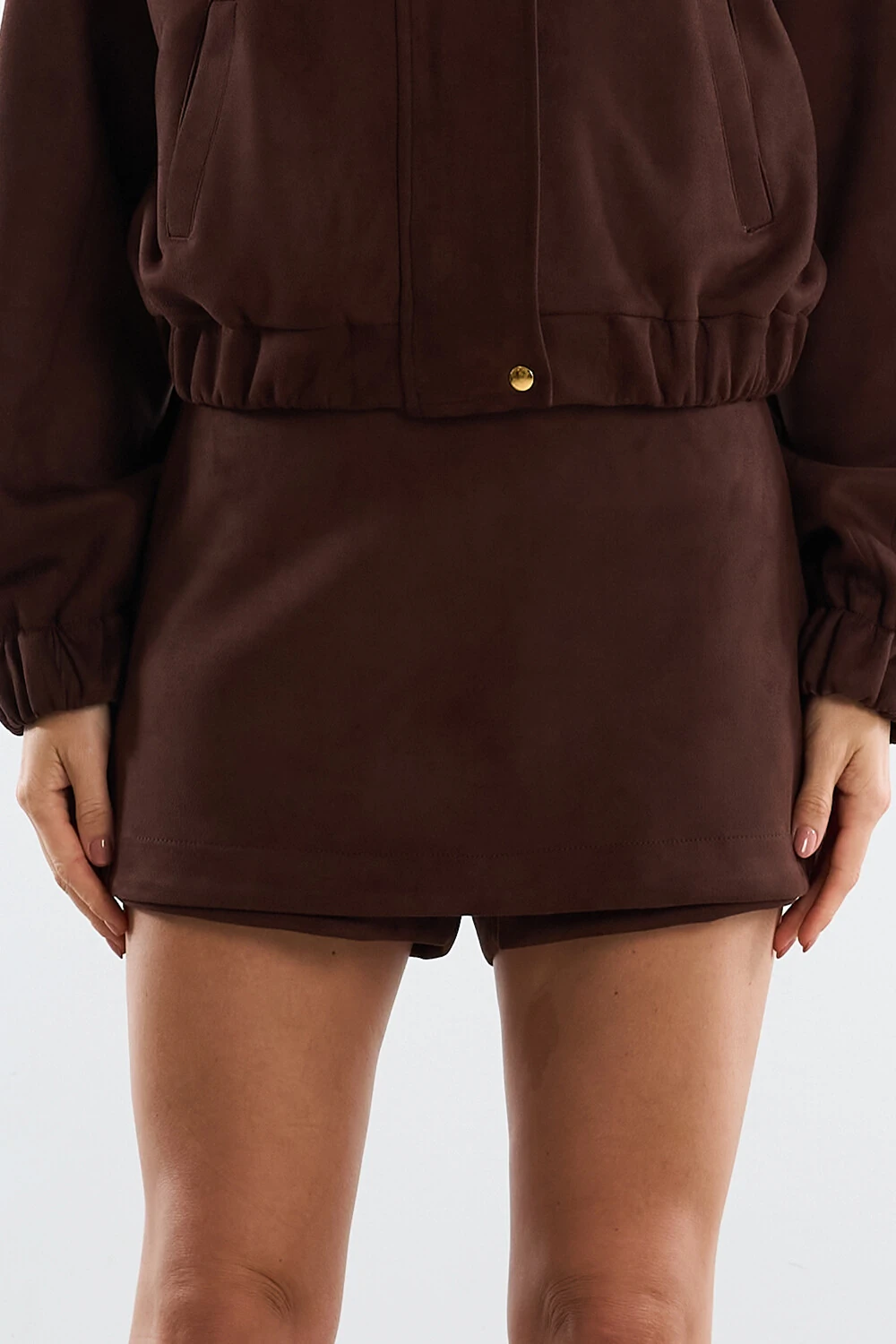 Short saia confeccionado em tecido encorpado. A peça possui cintura alta, passantes aplicados, shape solto, caimento reto, acabamento pespontado e fechamento lateral por zíper. Acompanha cinto do próprio tecido com fivela forrada