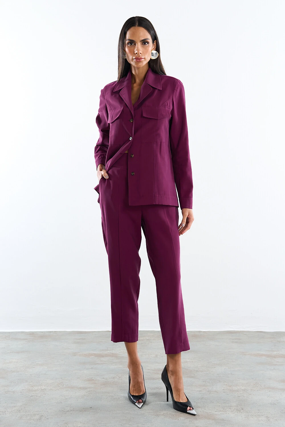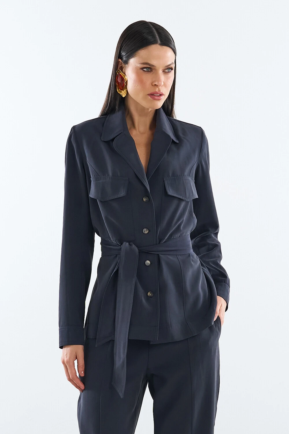 Camisa confeccionada em tecido leve. A peça possui lapela chanfrada, mangas longas com fechamento por botão nos punhos, bolsos frontais. recortes frontais e posterior, ombreiras aplicadas, fenda posterior, shape solto, caimento reto, acabamento pespontado e fechamento frontal por botões. Acompanha faixa do próprio tecido para amarração.