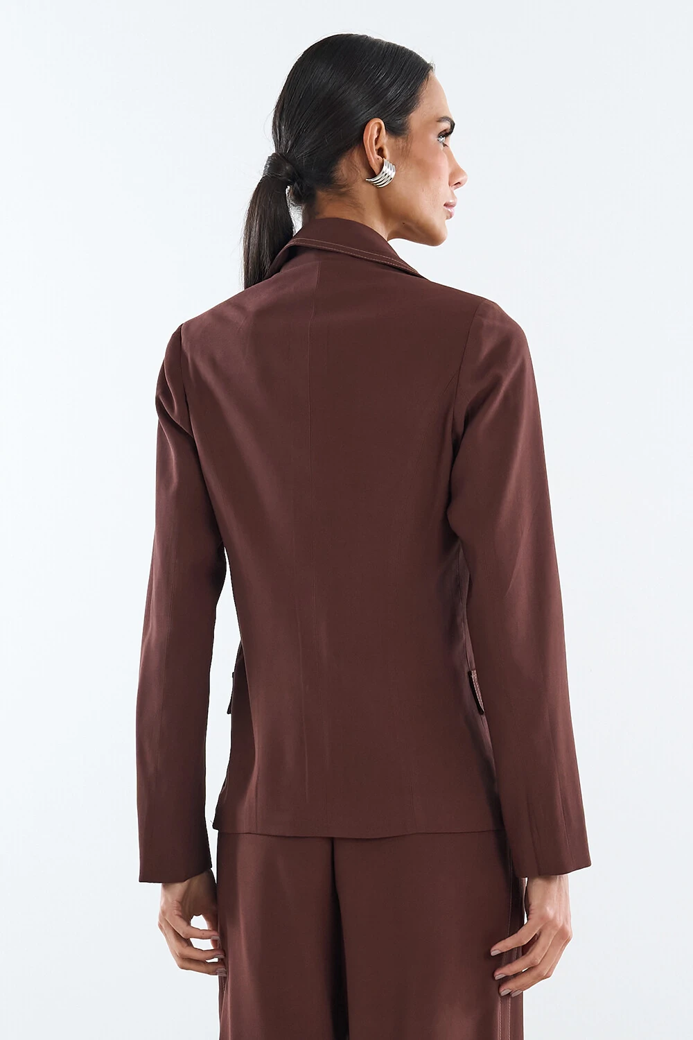 Blazer confeccionado em tecido leve. A peça possui lapela chanfrada, recortes frontais e posteriores, ombreiras aplicadas, mangas longas, forro, caimento reto, acabamento pespontado em contraste e fechamento frontal por botão