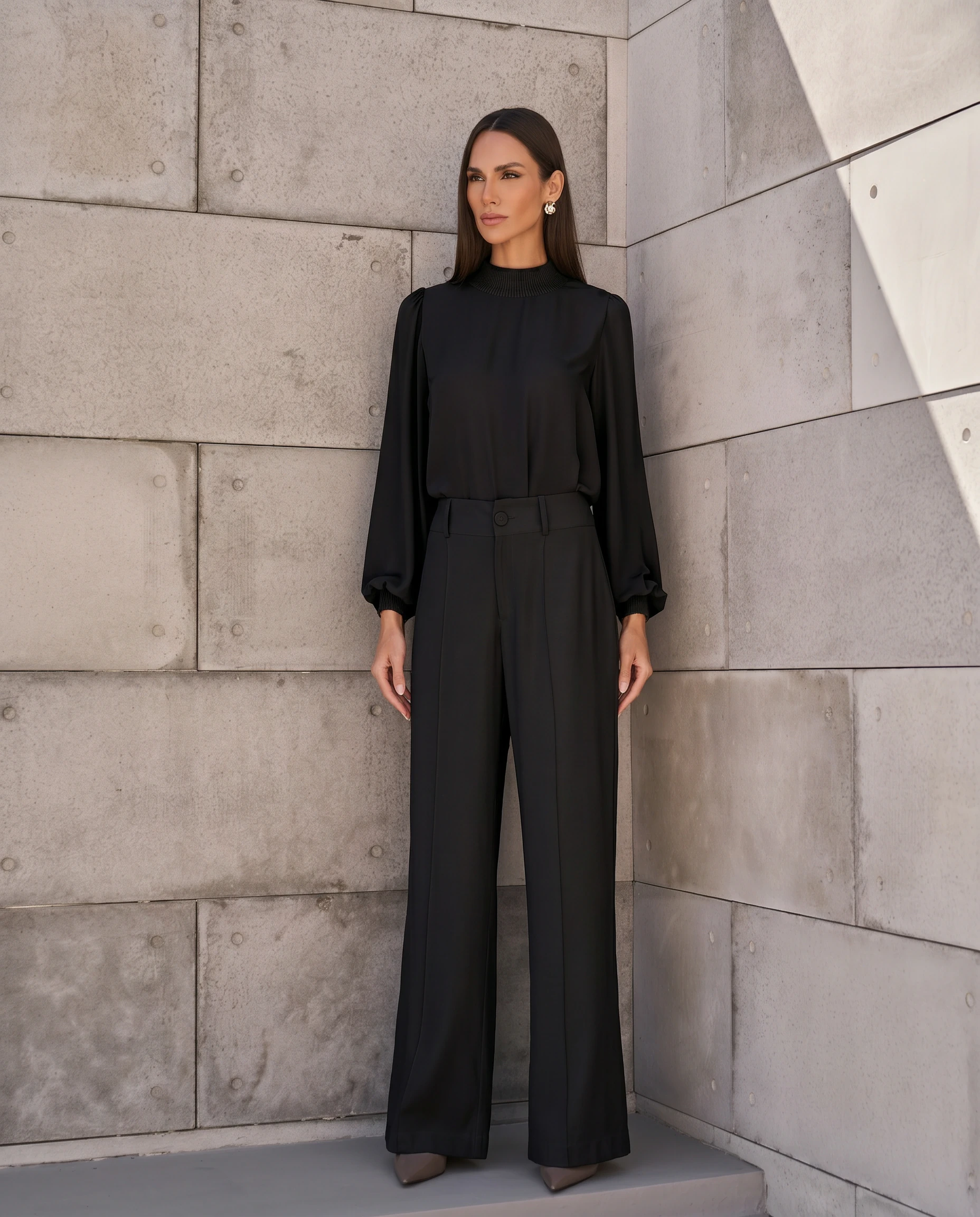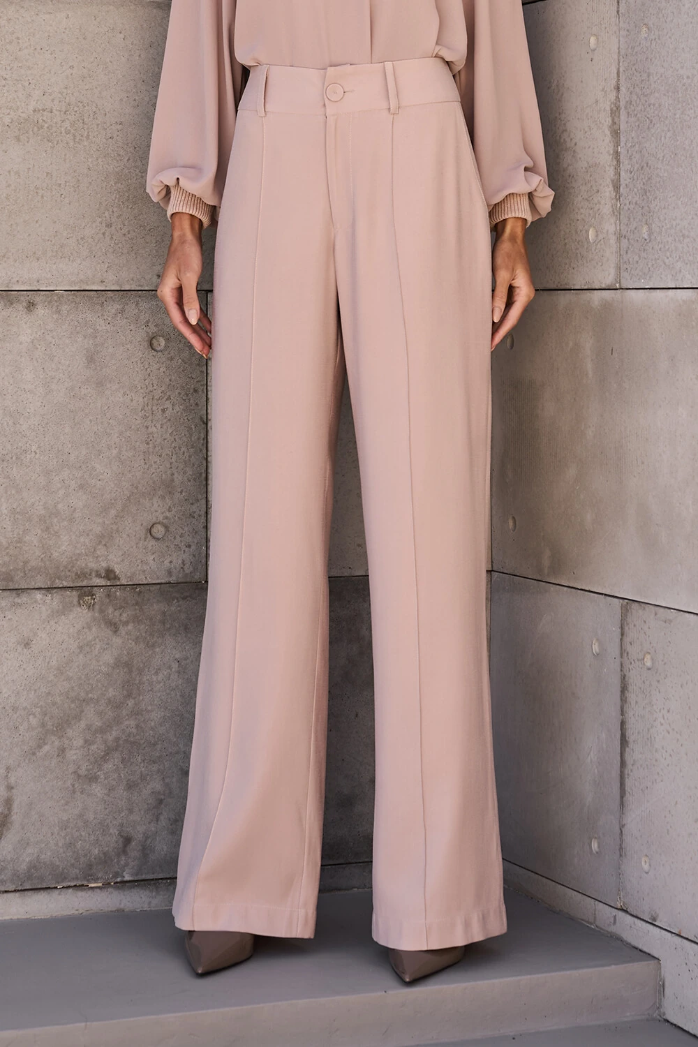 Calça confeccionada em tecido leve. A peça possui cintura alta, cós com passantes aplicados, bolsos frontais e posteriores, recorte frontal, shape solto, caimento reto, acabamento pespontado e fechamento frontal por zíper e botão forrado.