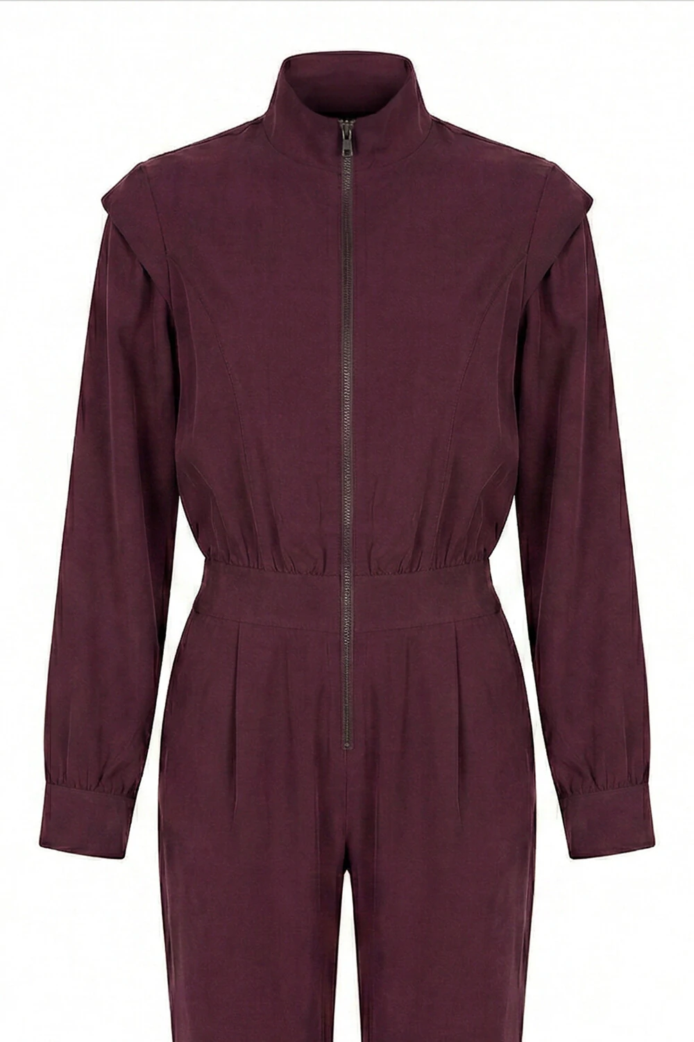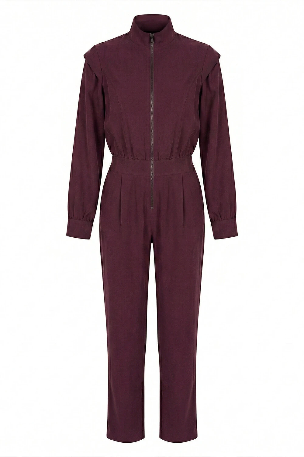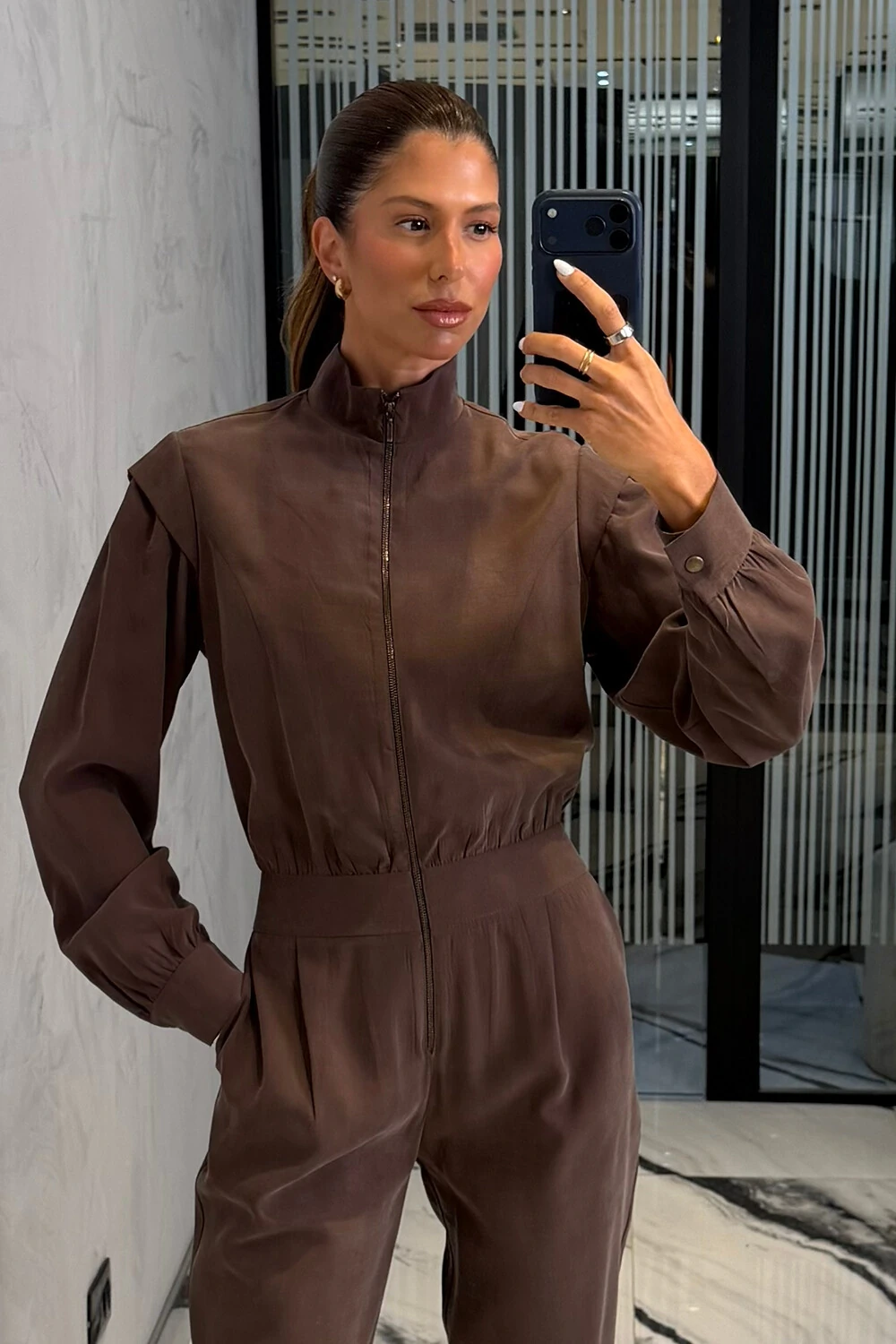 Macacão confeccionado em tecido leve. A peça possui gola alta, mangas longas com punhos, bolsos frontais, pequenas pregas na cintura, acabamento pespontado e fechamento frontal por zíper metálico