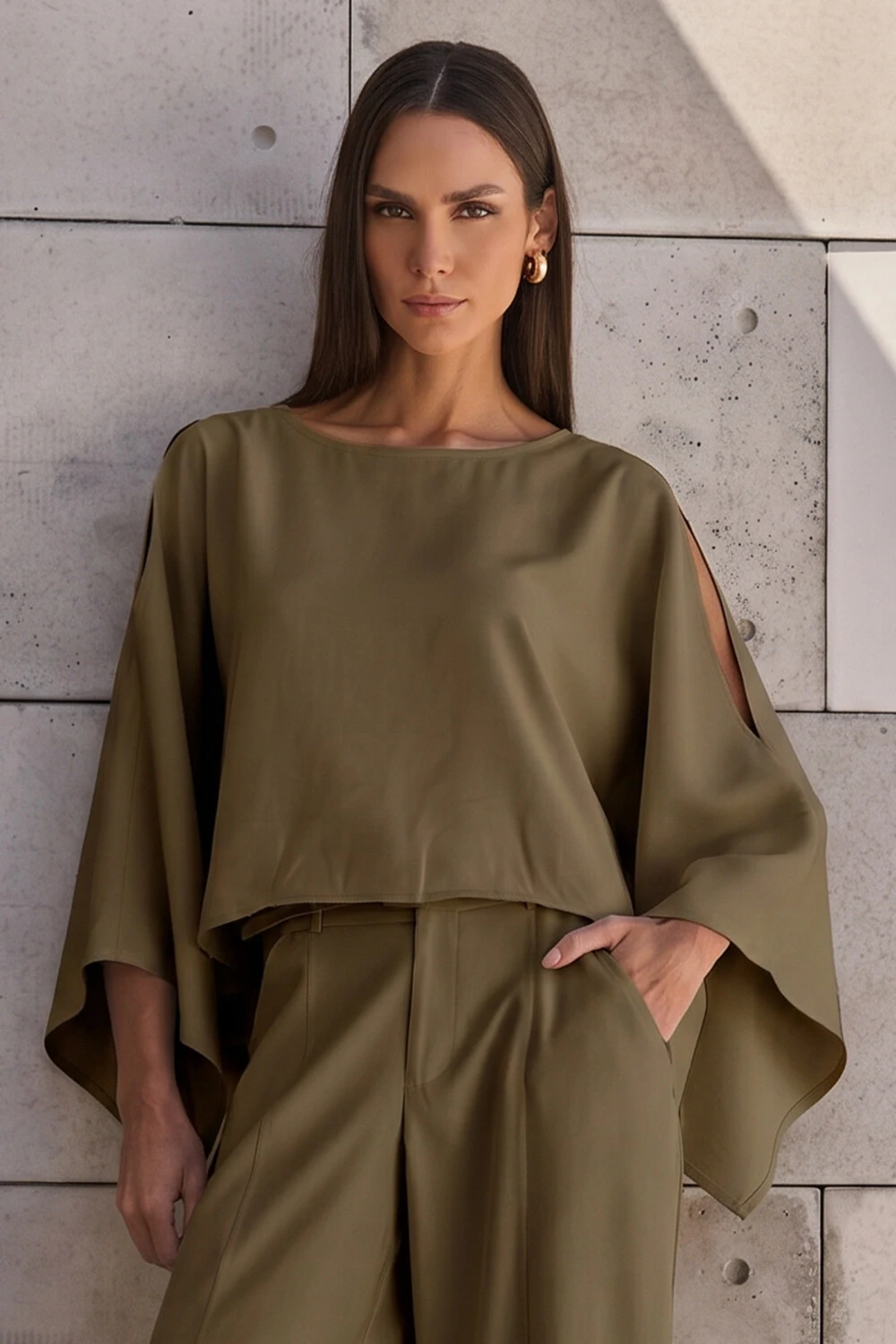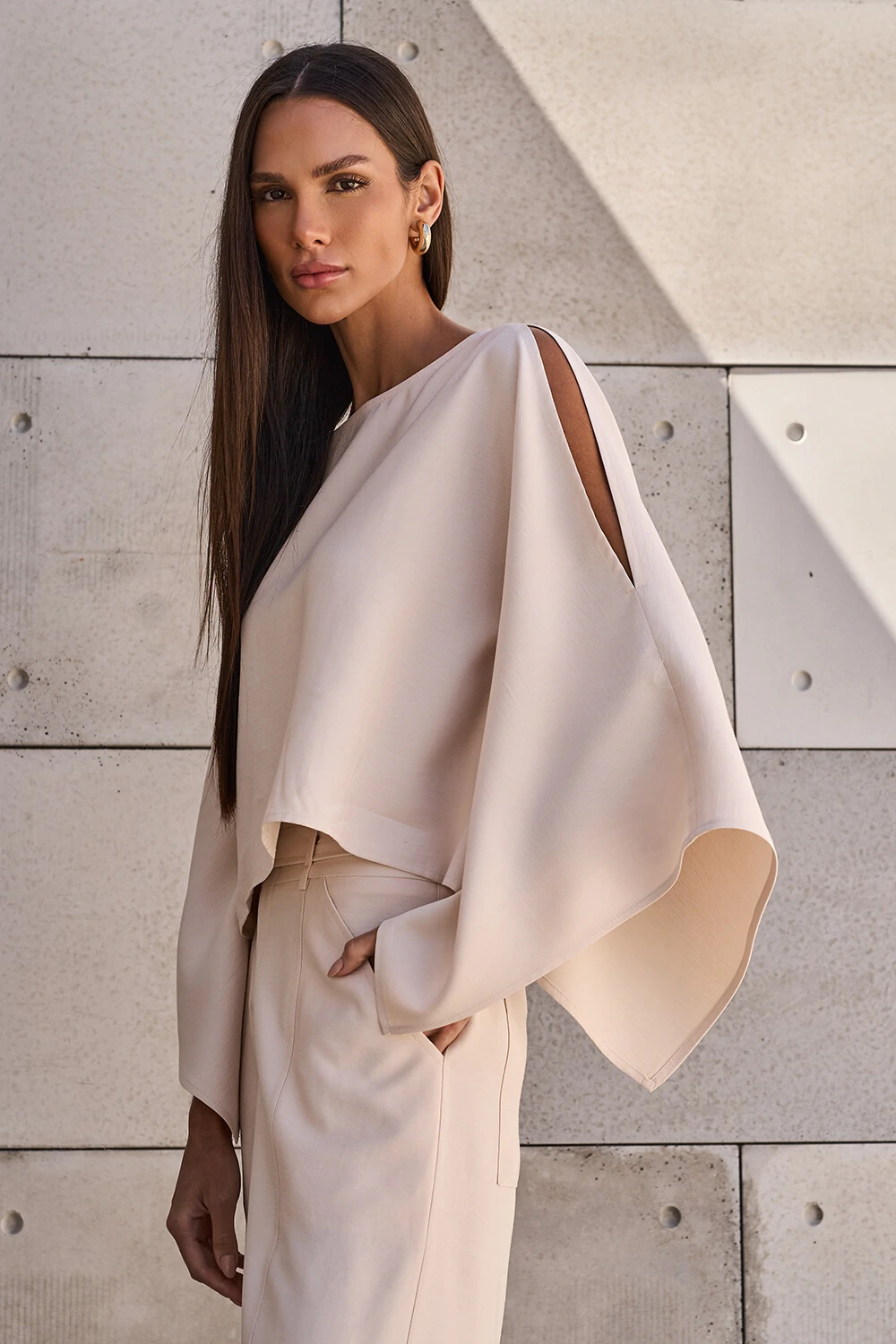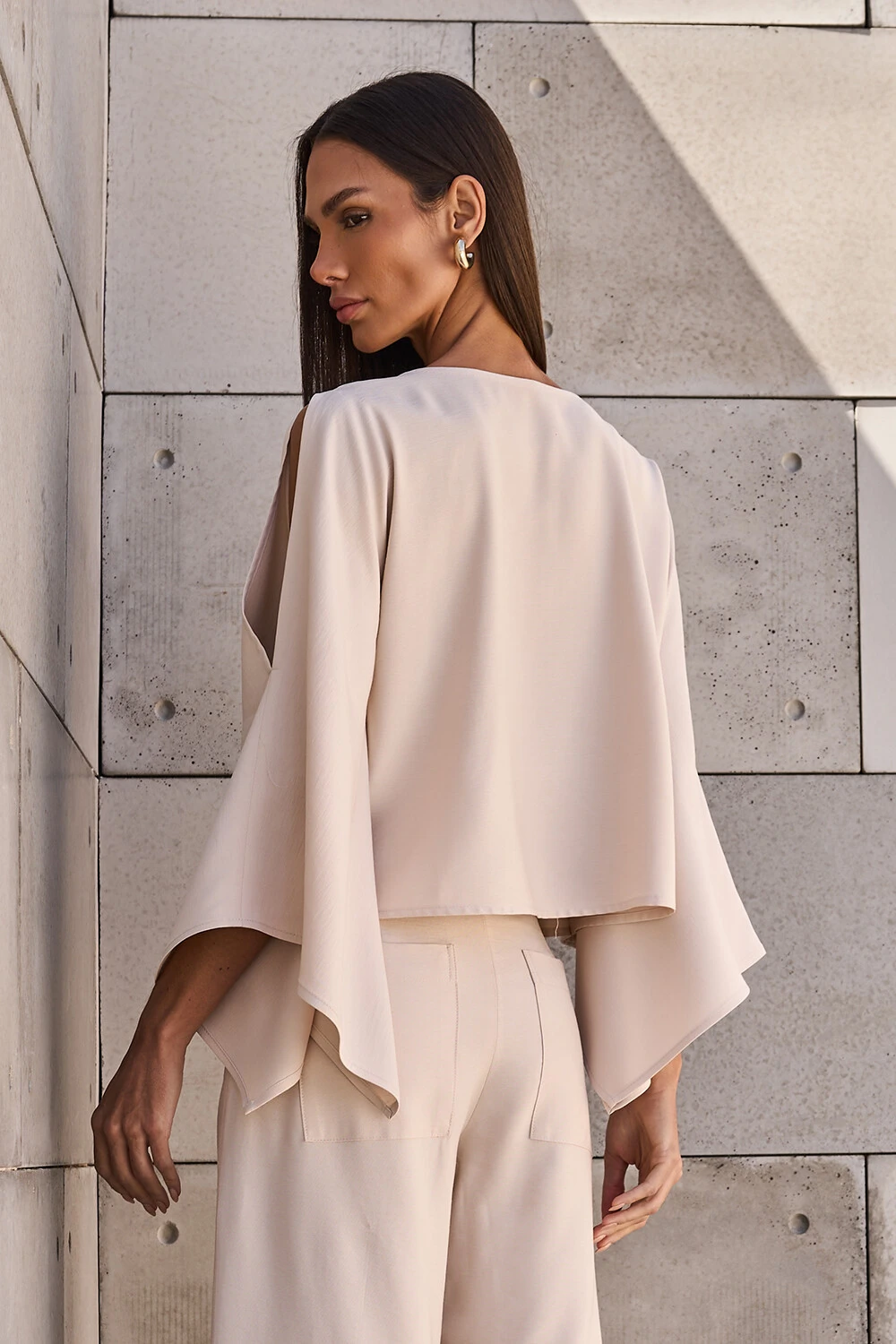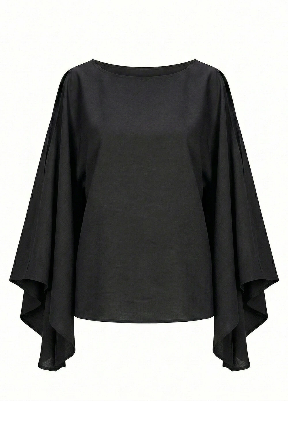 Blusa confeccionada em tecido leve. A peça possui decote redondo, fendas nos ombros, mangas amplas e acabamento pespontado.