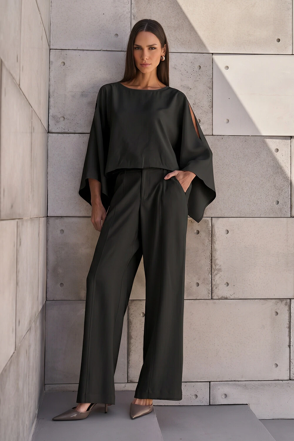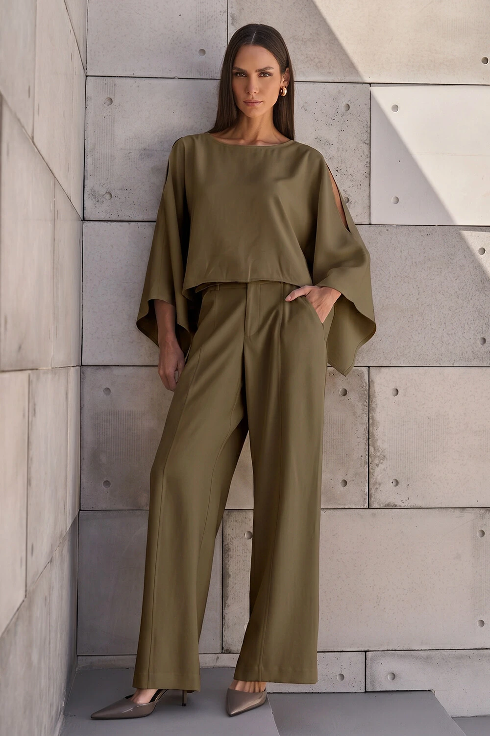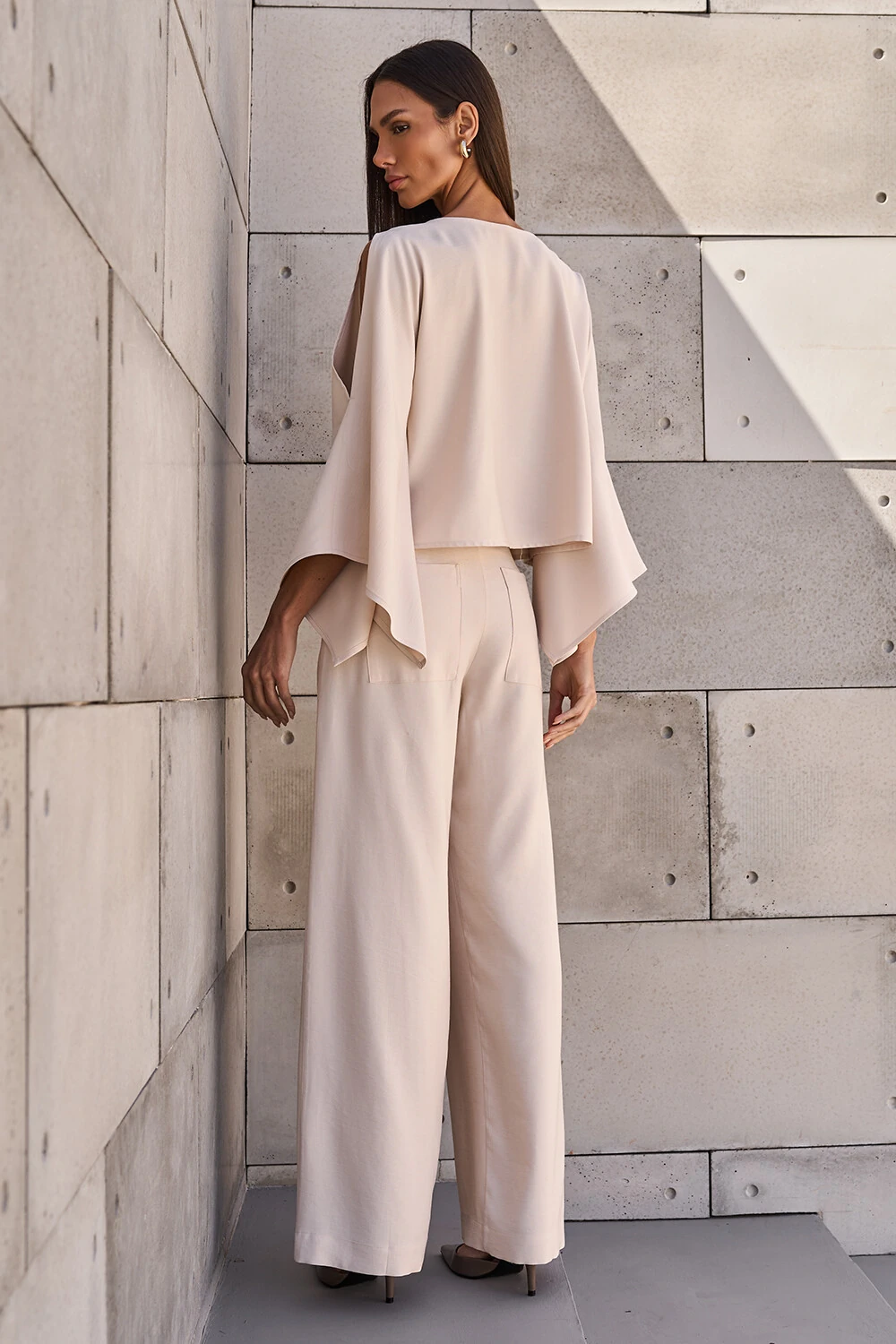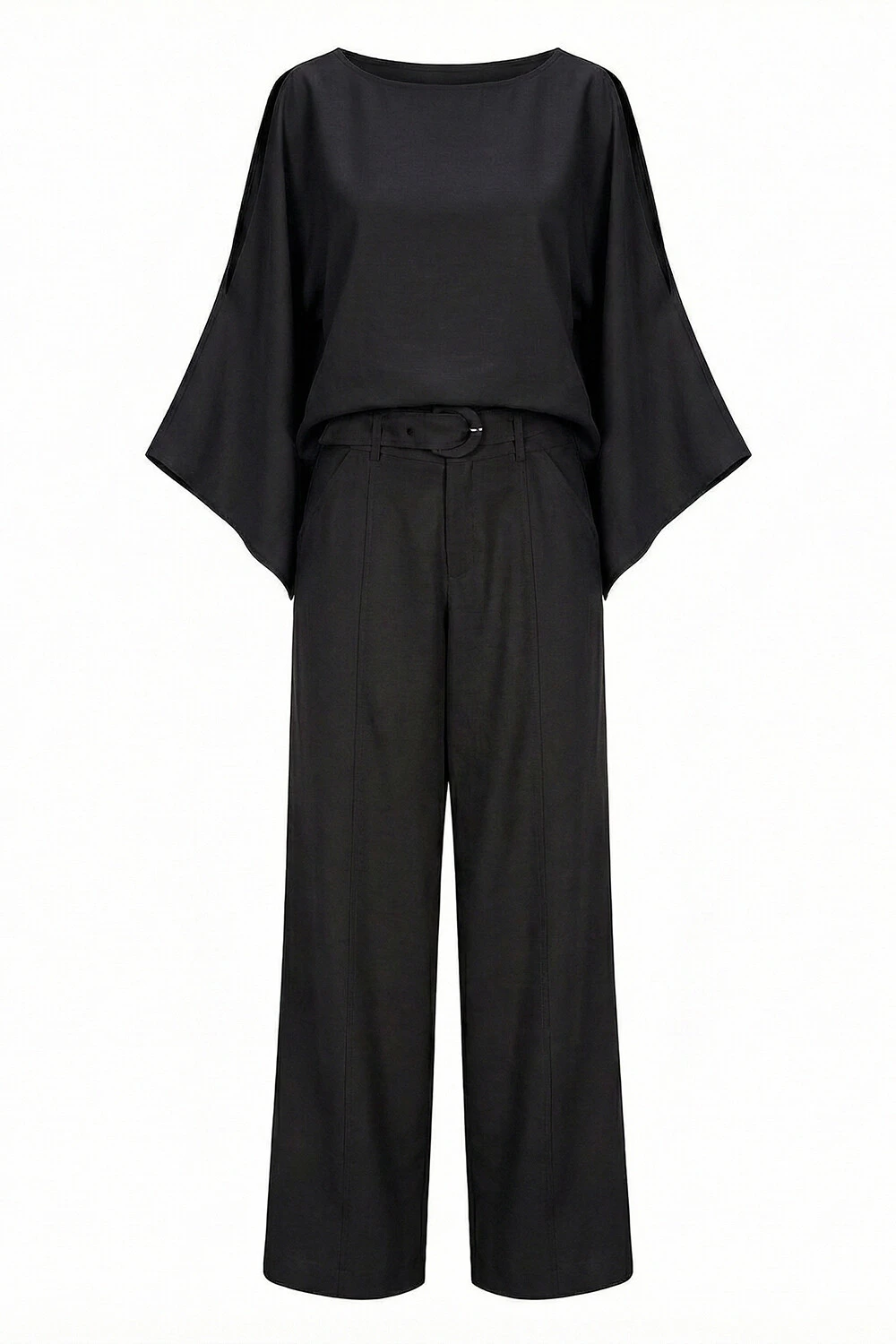 Blusa confeccionada em tecido leve. A peça possui decote redondo, fendas nos ombros, mangas amplas e acabamento pespontado.