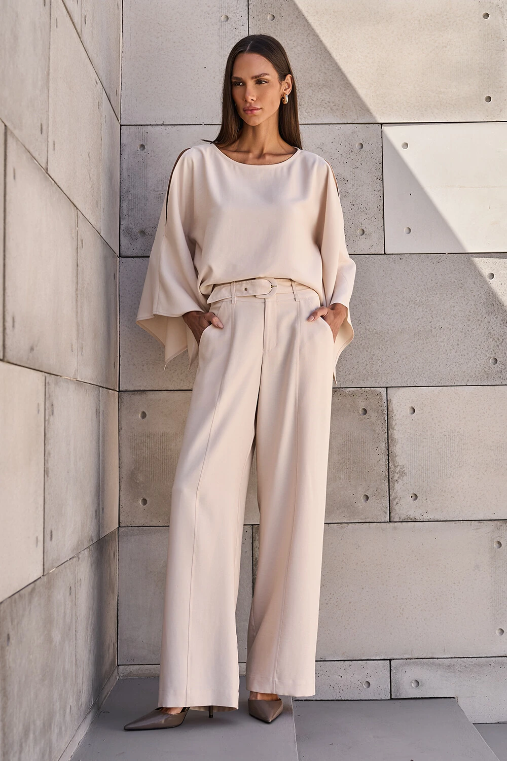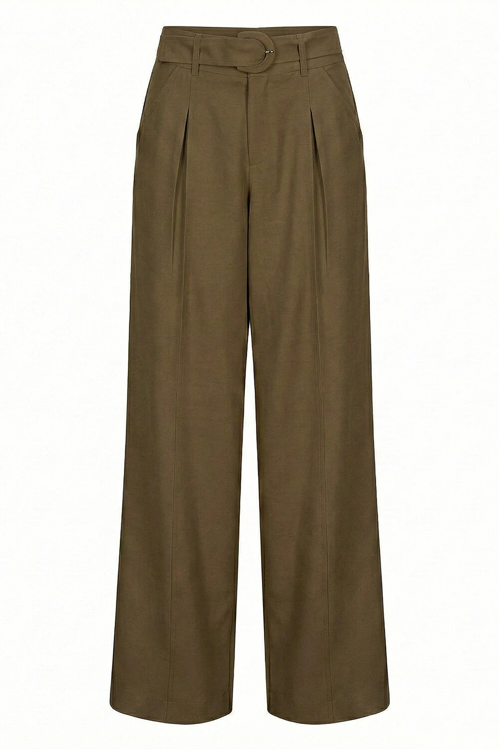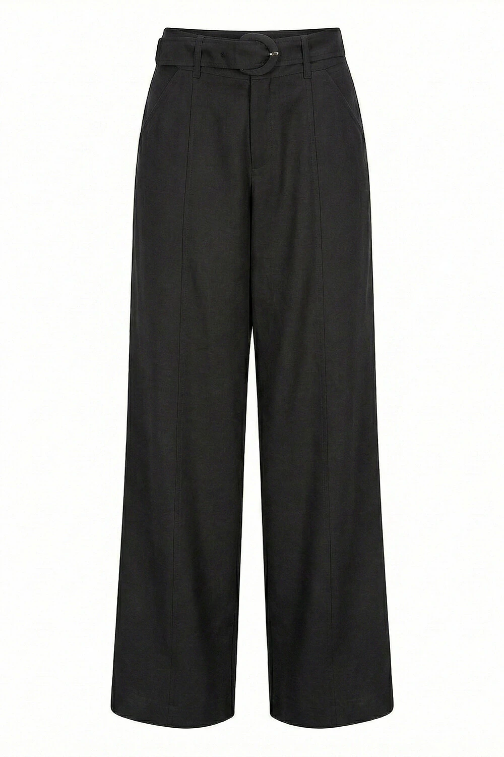 Calça confeccionada em tecido leve. A peça possui cintura alta, cós largo com passantes aplicados, bolsos frontais e posteriores, recortes frontais, comprimento longo, caimento reto, acabamento pespontado e fechamento frontal por zíper. Acompanha cinto do próprio tecido com fivela forrada.