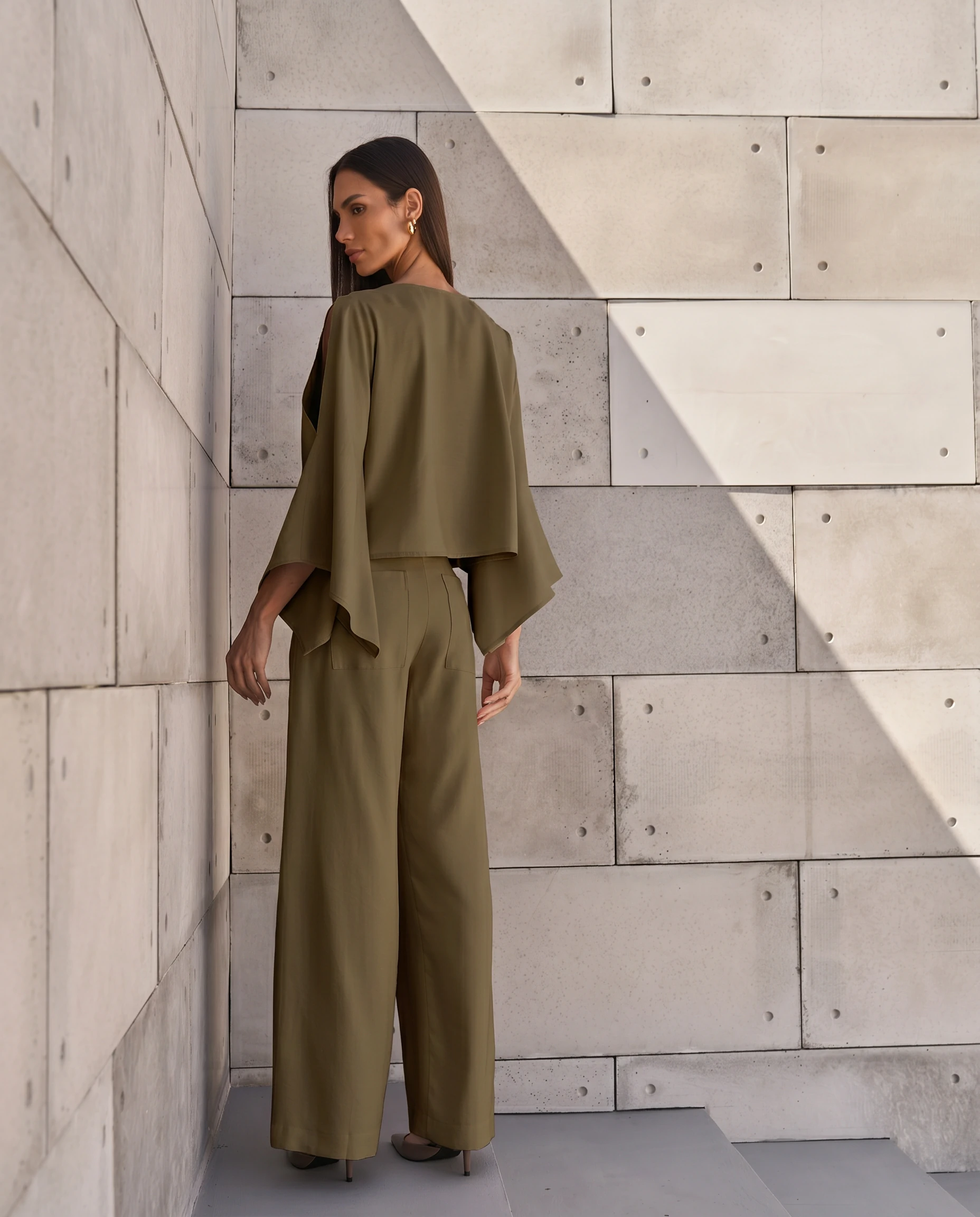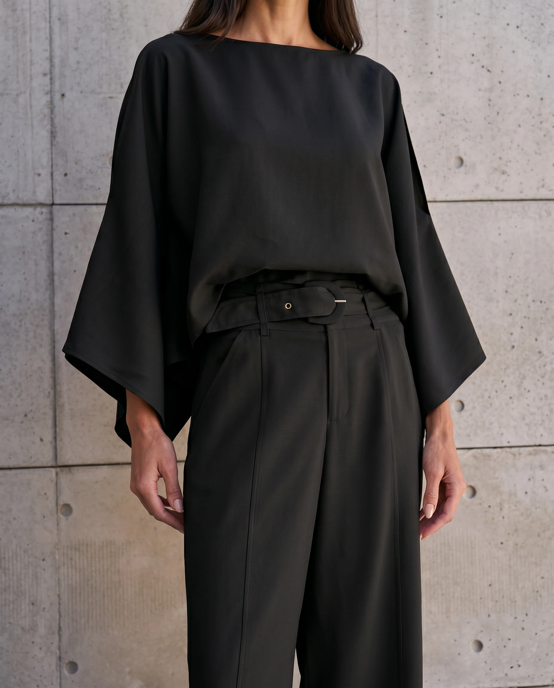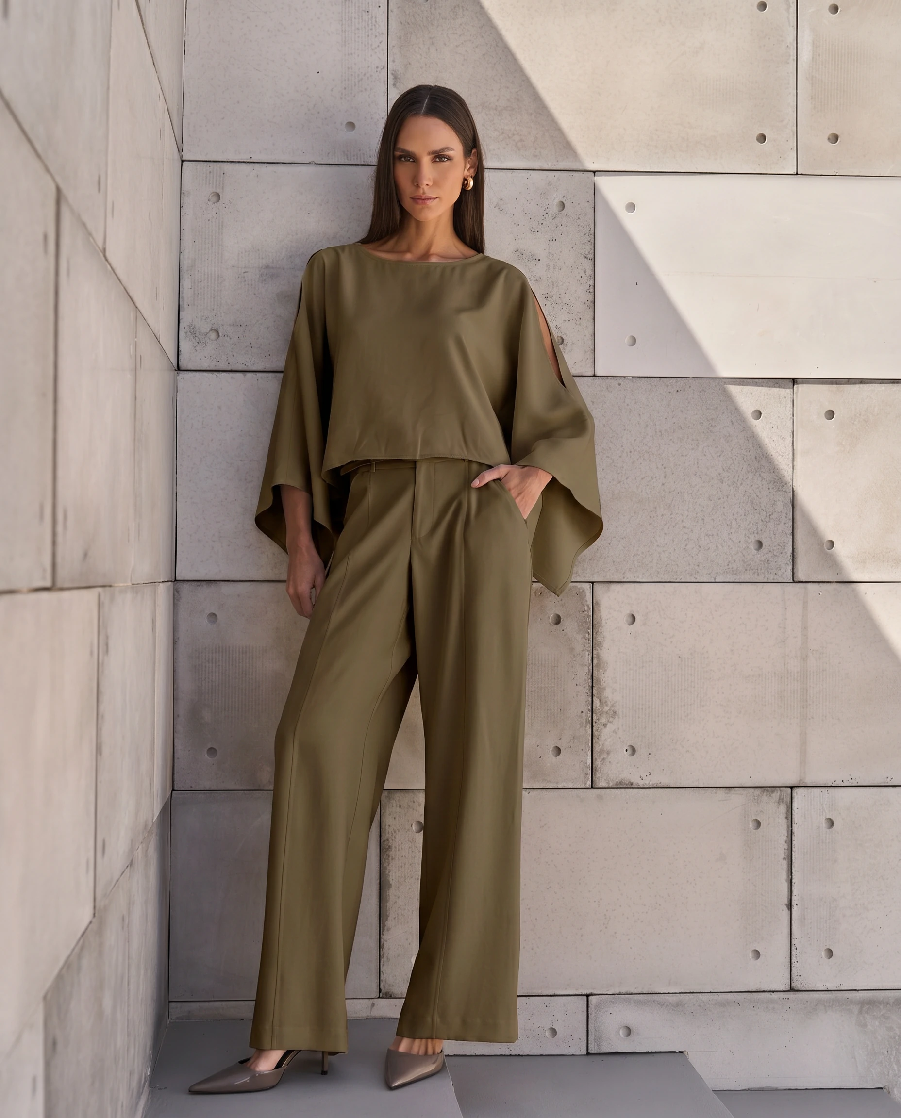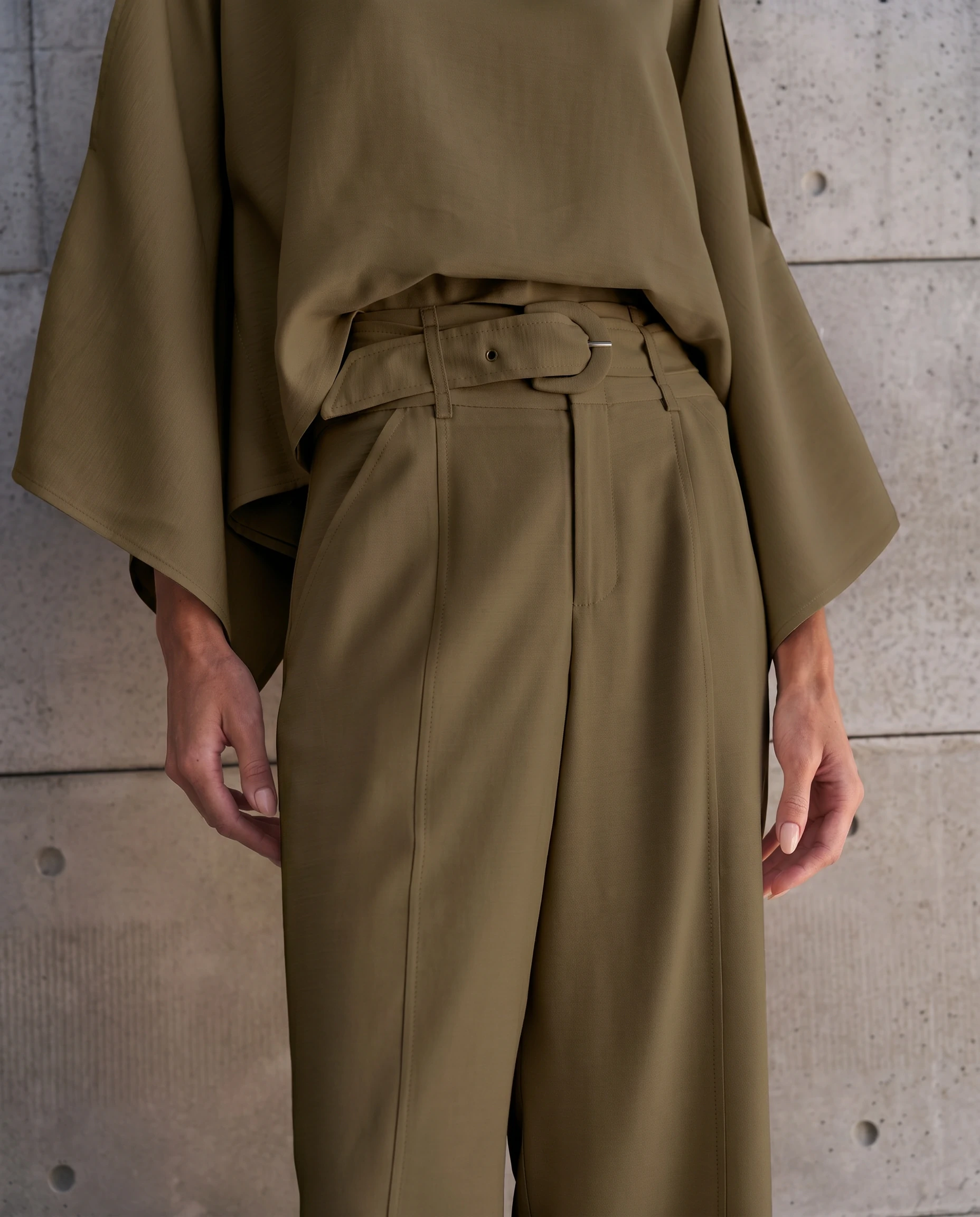 Calça confeccionada em tecido leve. A peça possui cintura alta, cós largo com passantes aplicados, bolsos frontais e posteriores, recortes frontais, comprimento longo, caimento reto, acabamento pespontado e fechamento frontal por zíper. Acompanha cinto do próprio tecido com fivela forrada.