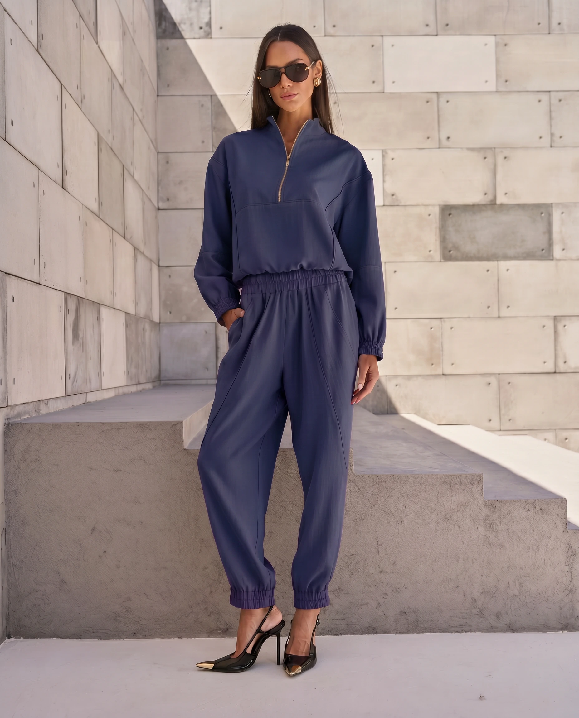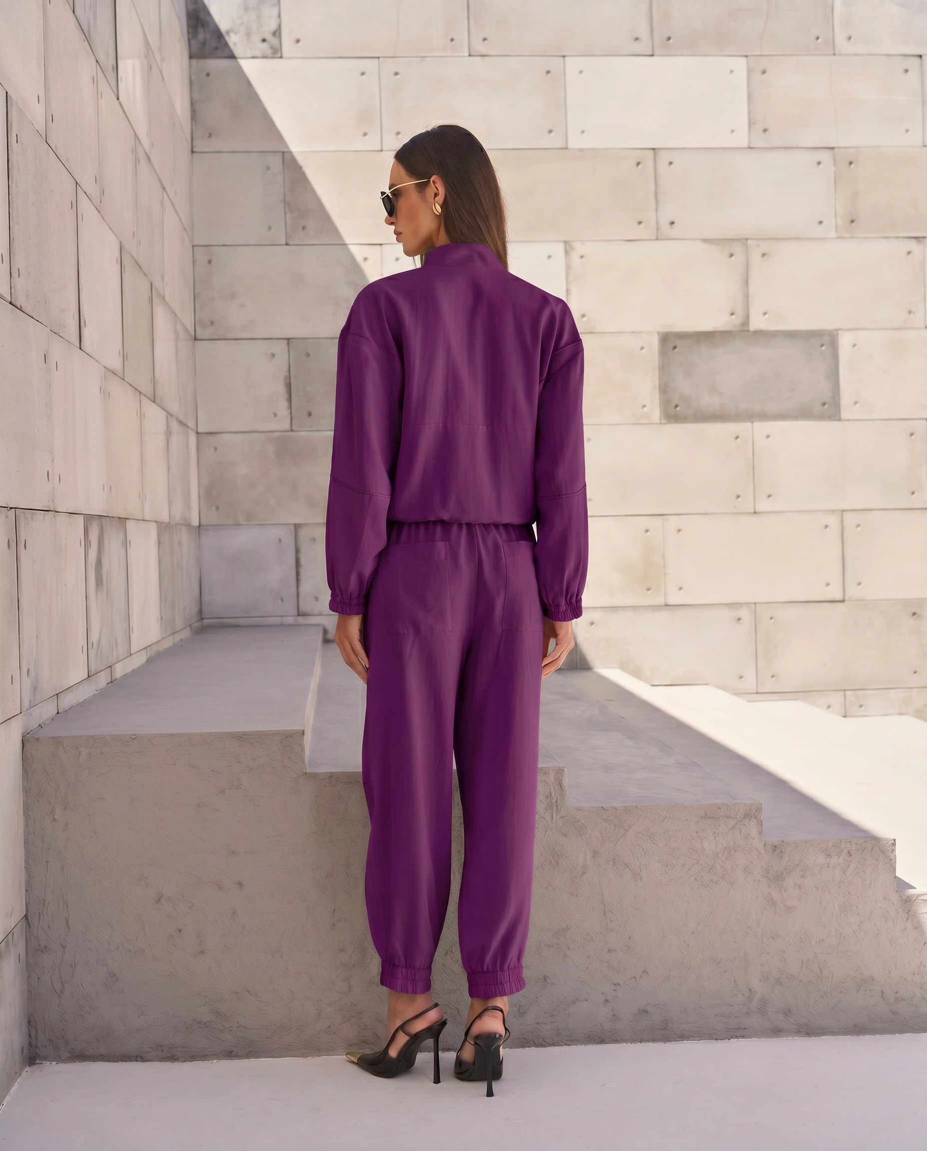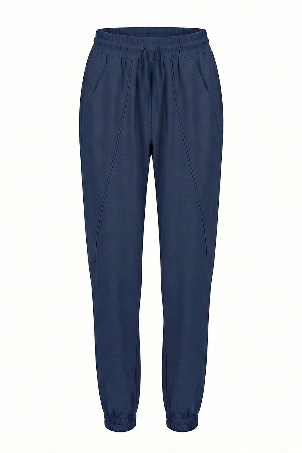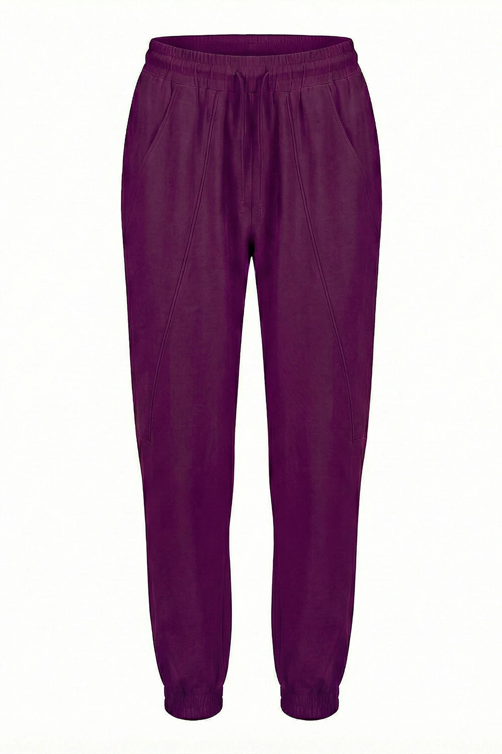 Calça confeccionada em tecido leve. A peça possui cintura alta, cós com elástico aplicado, bolsos frontais e posteriores, recortes frontais com detalhe de vivo, shape solto, punho com elástico aplicado e acabamento pespontado.