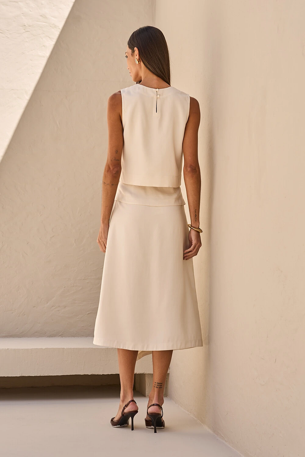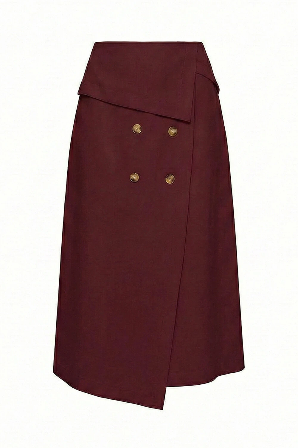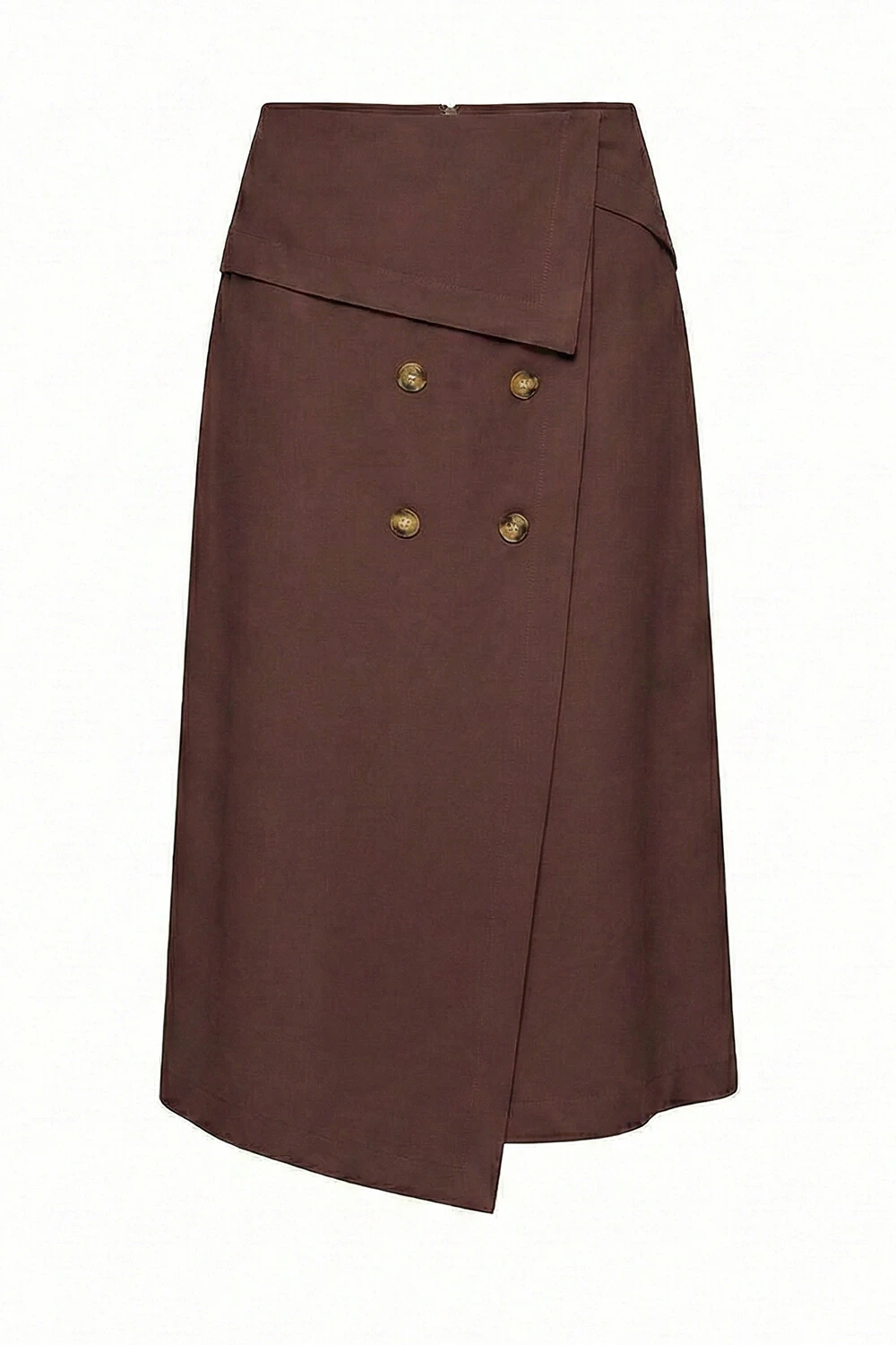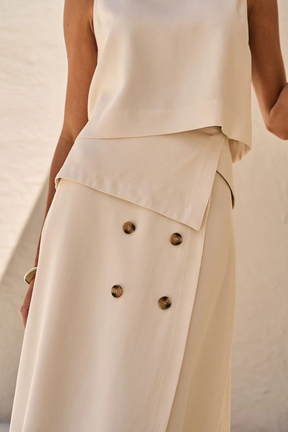 Saia confeccionada em tecido leve. A peça possui cintura alta, pala assimétrica aplicada, botões aplicados na parte frontal, shape solto, comprimento midi, caimento reto, acabamento pespontado e fechamento lateral por zíper invisível.