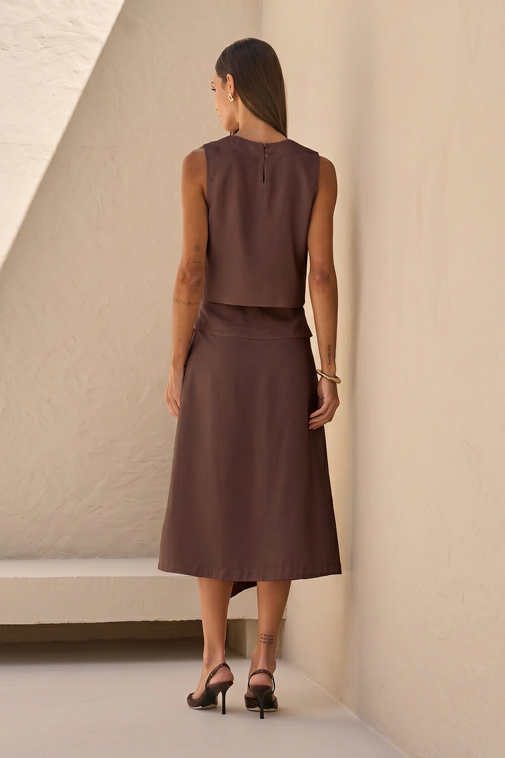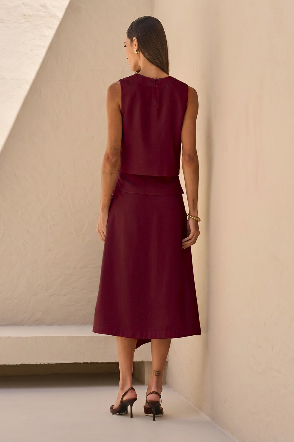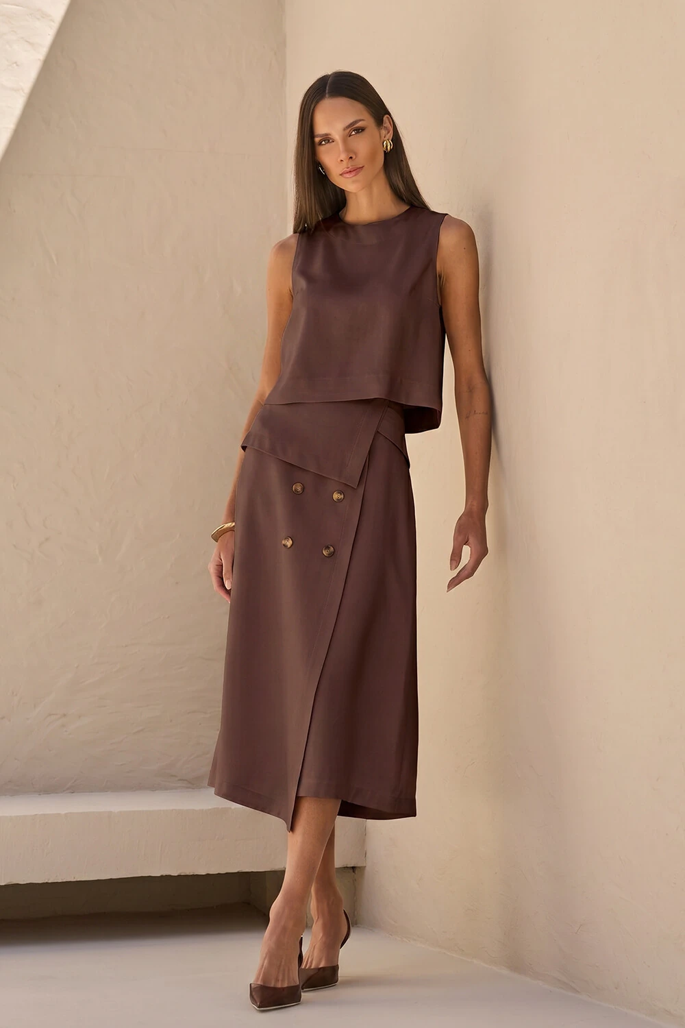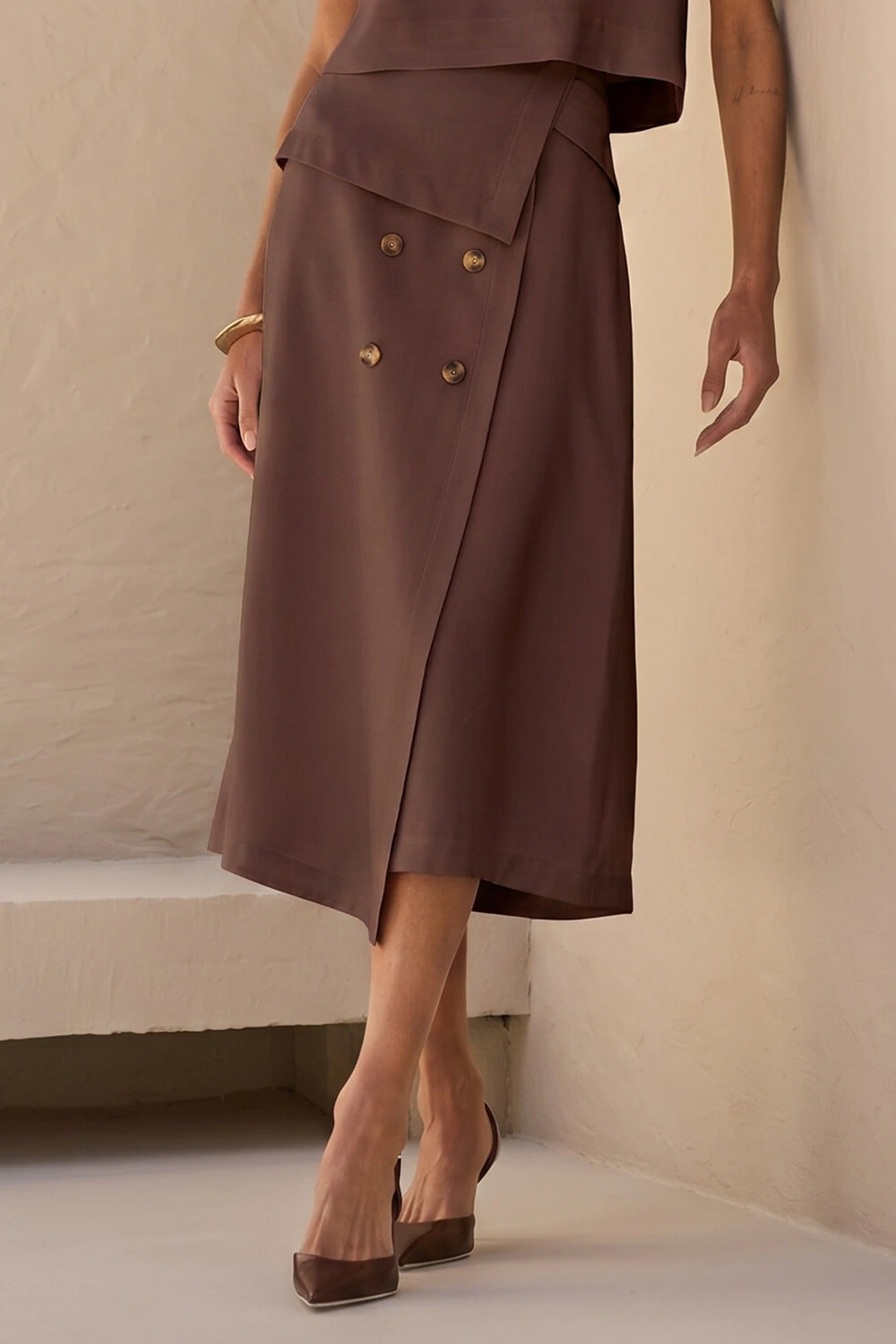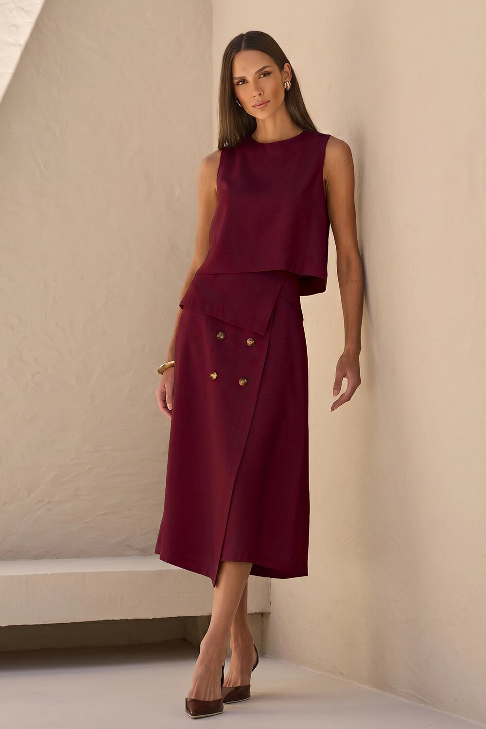 Saia confeccionada em tecido leve. A peça possui cintura alta, pala assimétrica aplicada, botões aplicados na parte frontal, shape solto, comprimento midi, caimento reto, acabamento pespontado e fechamento lateral por zíper invisível.