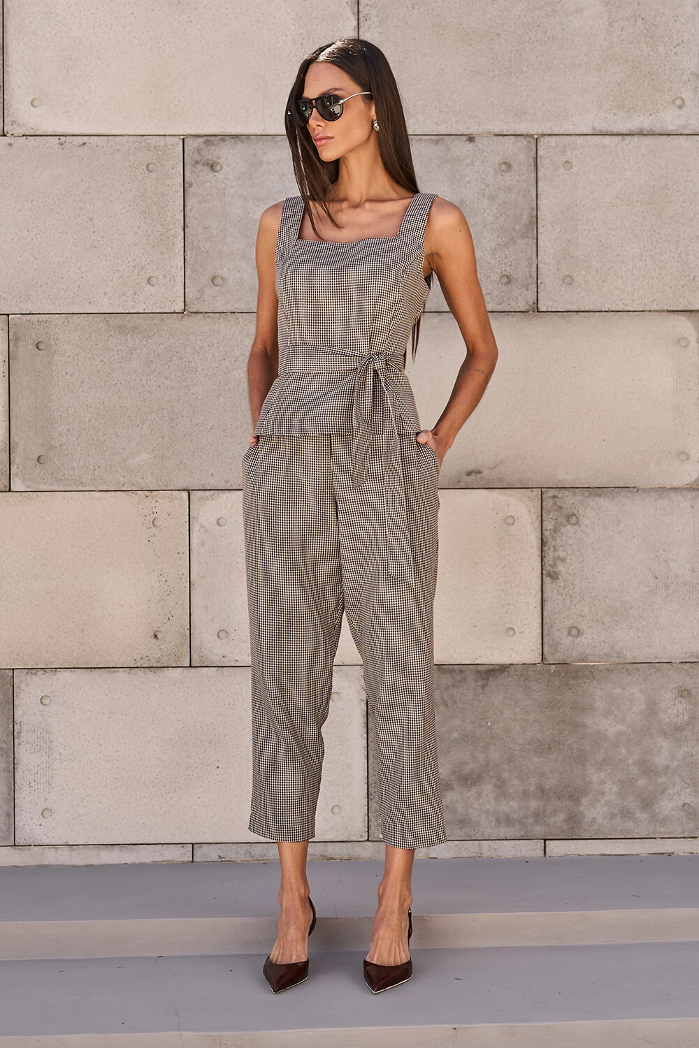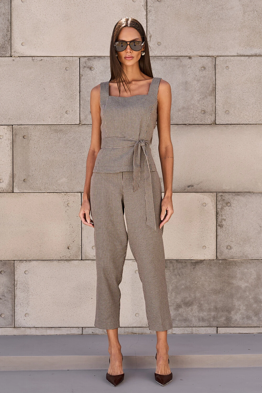 Calça confeccionada em tecido leve com padronagem xadrez. A peça possui cintura alta, bolsos frontais, bolsos posteriores, shape cenoura, acabamento pespontado e fechamento lateral por zíper.